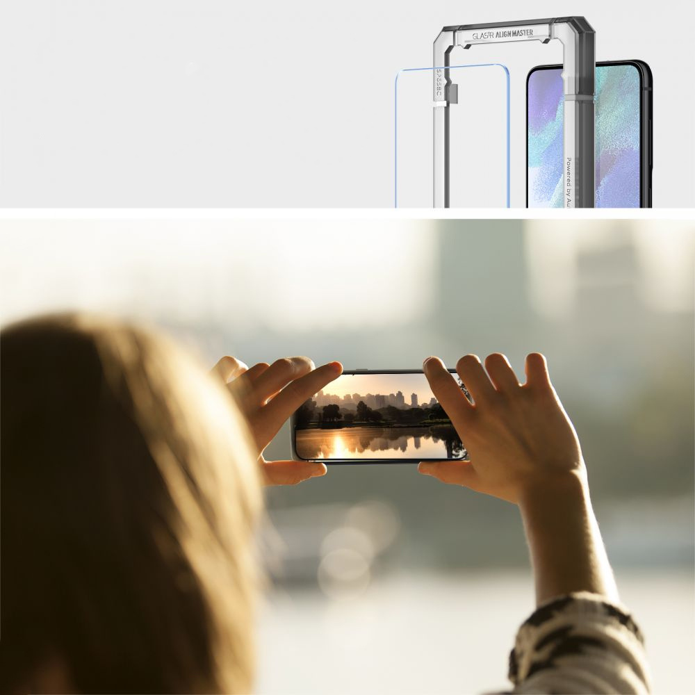 Gehärtetes Glas der Marke Spigen aus der AlignMaster Glas.tR- Serie für Samsung Galaxy S21 FE ist ein hochwertiges Produkt, das einen hervorragenden Schutz für unser Gerät bietet. Es ist mit einem perfekt auf die Vorderseite des Telefons zugeschnittenen Montagerahmen ausgestattet, der das Glas perfekt auf dem Bildschirm positioniert.
