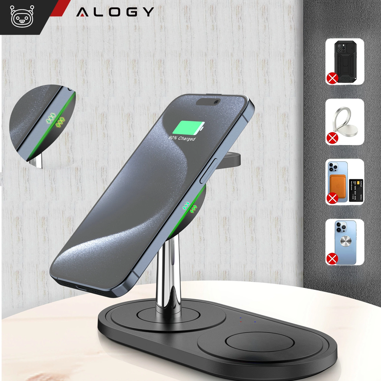 3in1 induktives Ladegerät für Telefonuhr-Kopfhörer Alogy Qi-Ladegerät für Apple iPhone Watch AirPods Schwarz x 1