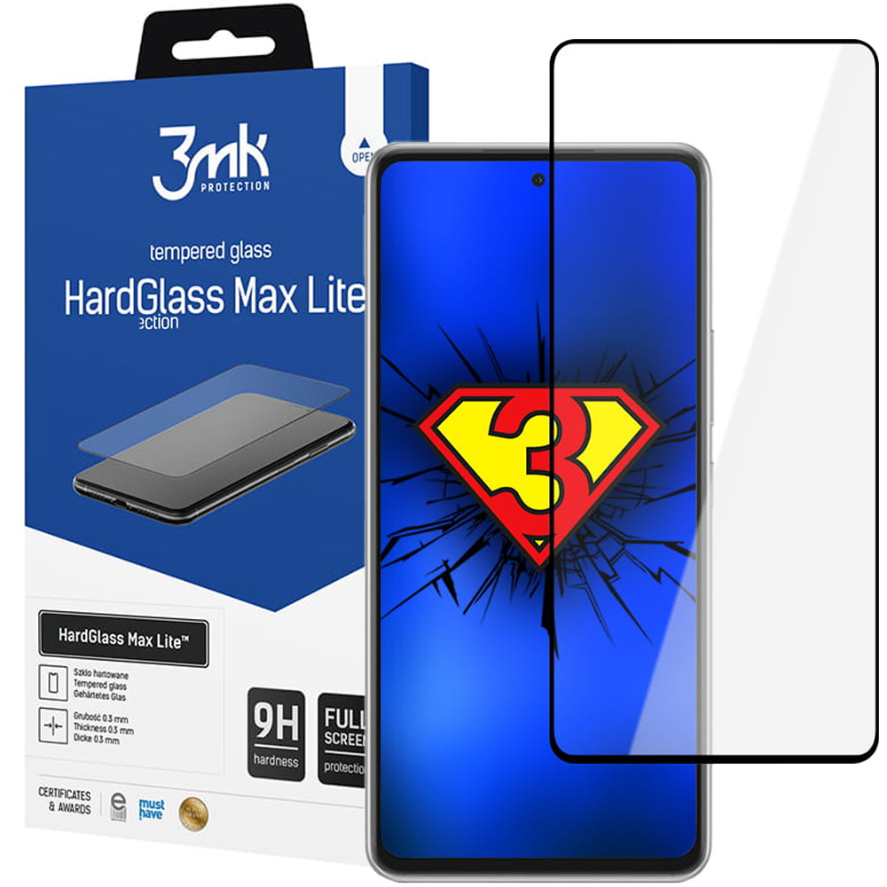 Original gehärtetes 3mk® -Glas aus der HardGlass Max Lite -Serie, das dem Samsung Galaxy A53 5G gewidmet ist, wurde speziell entwickelt und profiliert, um den größtmöglichen Bereich des Gerätebildschirms abzudecken.