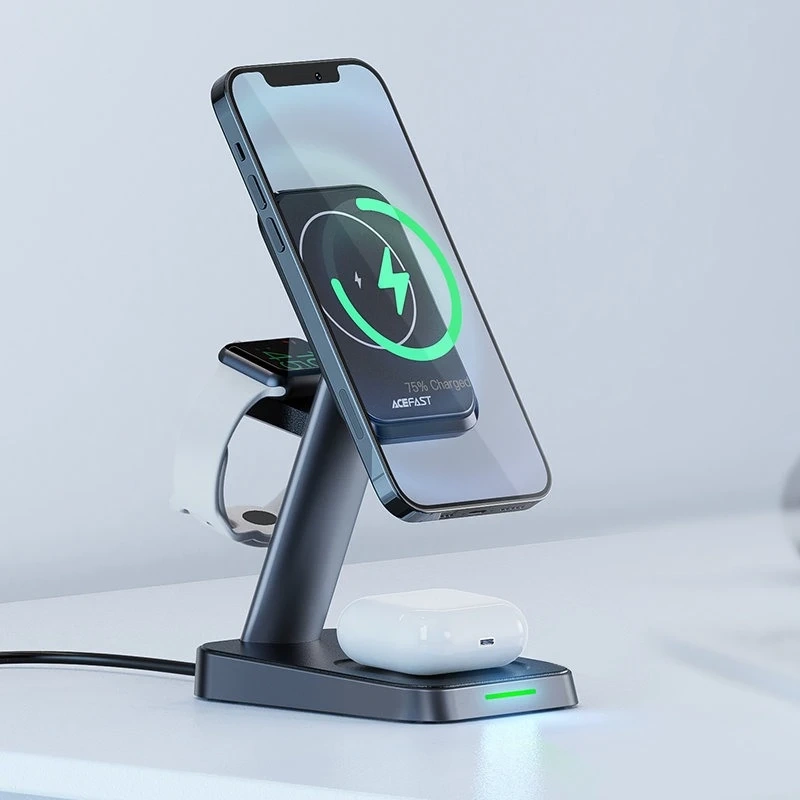 Eine kleine Station zum kabellosen Laden von drei Geräten gleichzeitig - Smartphones, Kopfhörer und Smartwatches. Es ist mit Telefonen kompatibel, die die MagSafe-Technologie unterstützen , einschließlich der iPhone 12-Serie und höher. Sie können das Acefast E3 bequem anpassen , indem Sie das Telefon horizontal oder vertikal ausrichten. Mit der Magnethalterung können Sie das Telefon bequem ablegen und fast sofort aufladen .