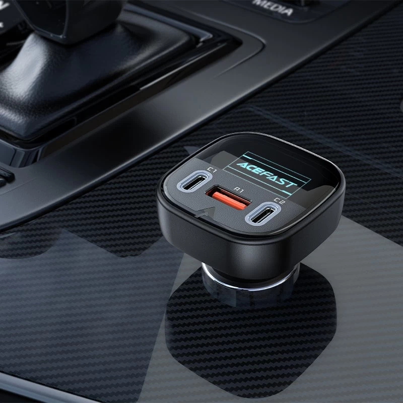 Acefast schnelles Autoladegerät. Es verfügt über 2 USB-Typ-C-Anschlüsse und einen USB-Anschluss. USB-Typ-C-Anschlüsse ermöglichen das Laden mit einer Leistung von bis zu 36 W für C1, bis zu 65 W und USB-Buchsen bis zu 36 W. Ermöglicht u.a. schnelles Aufladen in den Standards PPS, Power Delivery, Quick Charge 3.0, AFC und FCP. Es kann gleichzeitig mit 3 Geräten verbunden werden. Es besteht aus feuerfestem PC-Material. Es wurde mit vielen Schutzfunktionen wie Überhitzung, Überspannung, Hochspannung oder Überlastung ausgestattet.