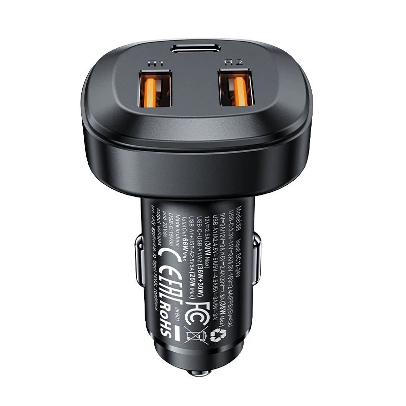 Acefast schnelles Autoladegerät. Es verfügt über 2 USB-Anschlüsse und 1 USB-Typ-C. USB-Anschlüsse ermöglichen das Aufladen mit einer Leistung von 30 W, insgesamt können sie einer Belastung von bis zu 25 W (5 V / 5 A) standhalten, während der USB-Typ-C-Anschluss das Aufladen mit einer Leistung ermöglicht von 36W. USB-Typ-C-Anschluss Ermöglicht schnelles Aufladen, inkl. in den Standards PPS, Power Delivery, Quick Charge 4.0, AFC und FCP. Es kann gleichzeitig mit 3 Geräten verbunden werden. Es besteht aus feuerfestem PC-Material. Es wurde mit vielen Schutzfunktionen wie Überhitzung, Überspannung, Hochspannung oder Überlastung ausgestattet.