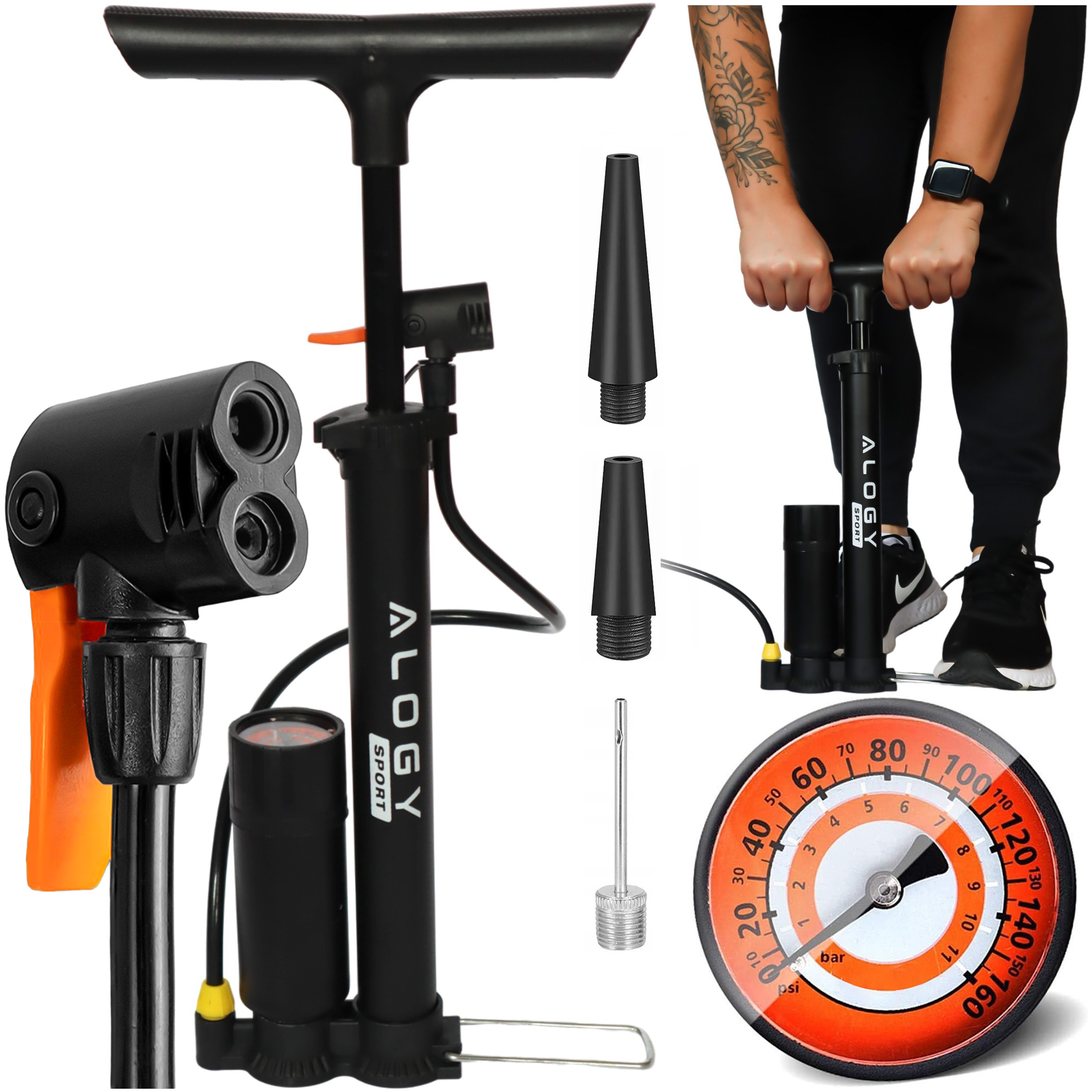 Alogy Fahrradpumpe 160 psi mit Manometer und Griff, manuell, Schwarz x 1