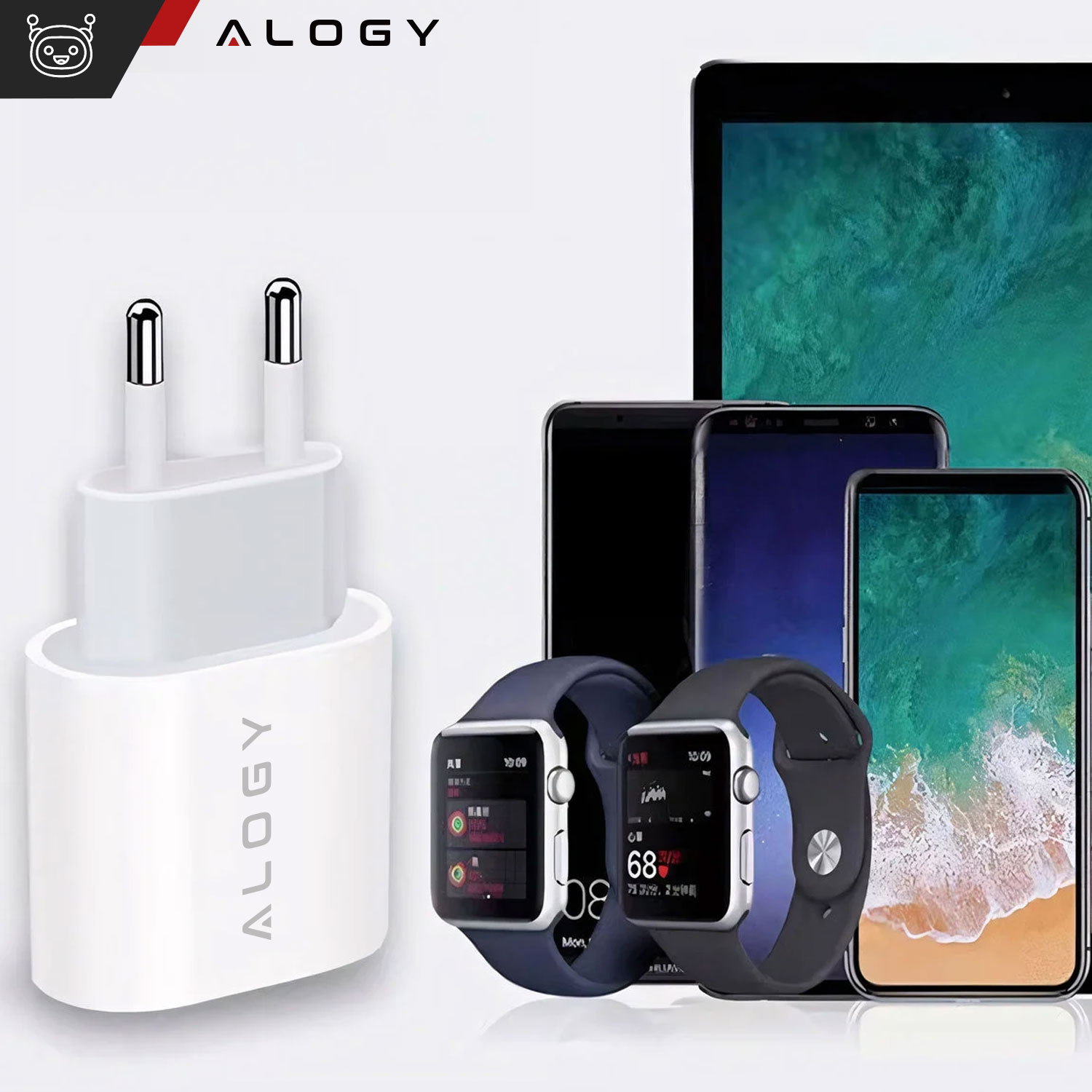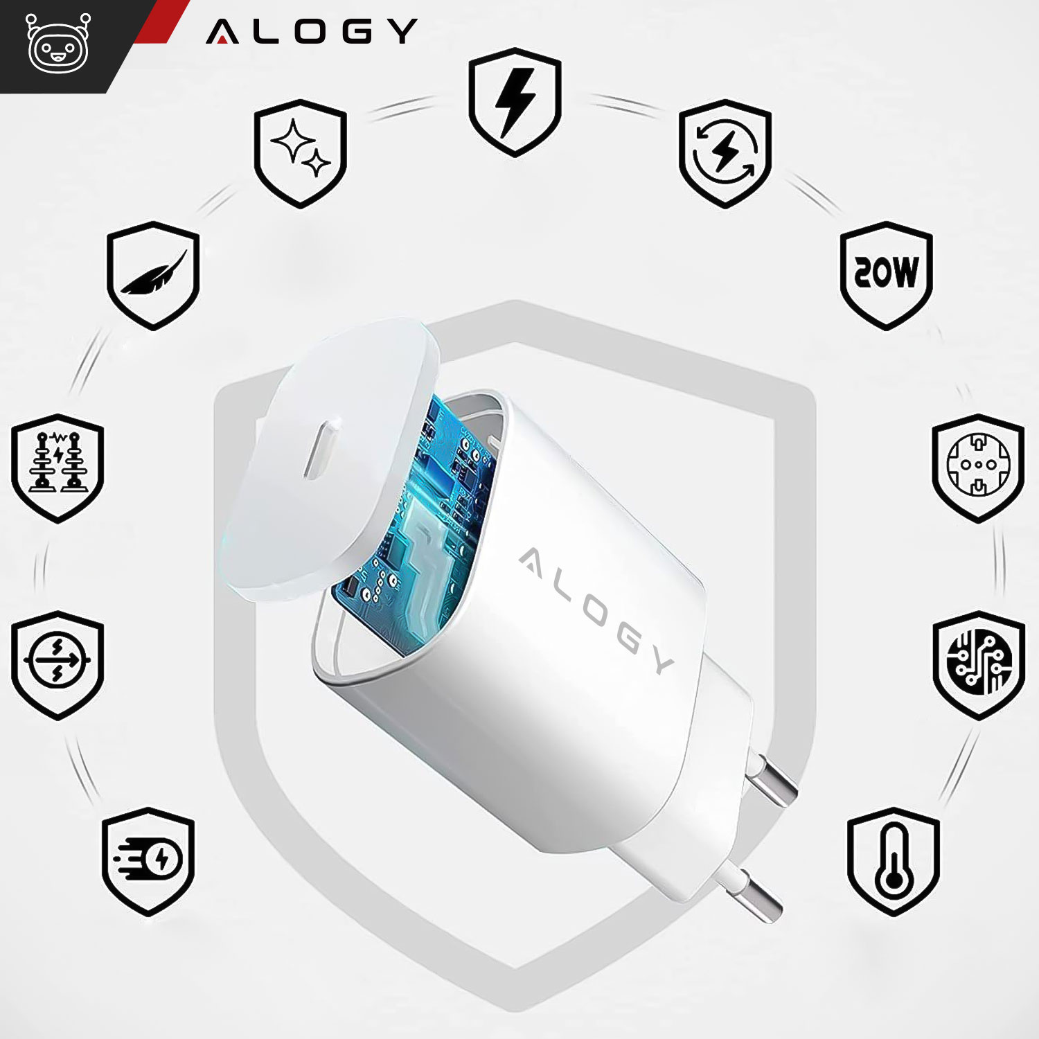 Das Wandladegerät der Marke Alogy ist ein klassisches Gerät mit minimalistischem Design. Ermöglichen Sie schnelles und sicheres Aufladen von mobilem Zubehör. Es verfügt über einen integrierten USB-C-Typ-C-Anschluss, der die Schnellladetechnologie unterstützt, dank der wir die Energie im Gerät schnell erneuern können.