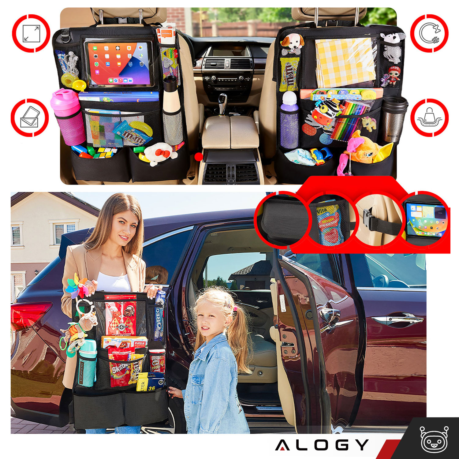 Auto-Organizer für Autositz, Rückenlehne, Autositz, Alogy-Schutz für Tablet, Schwarz, 2 Halterungen x 1
