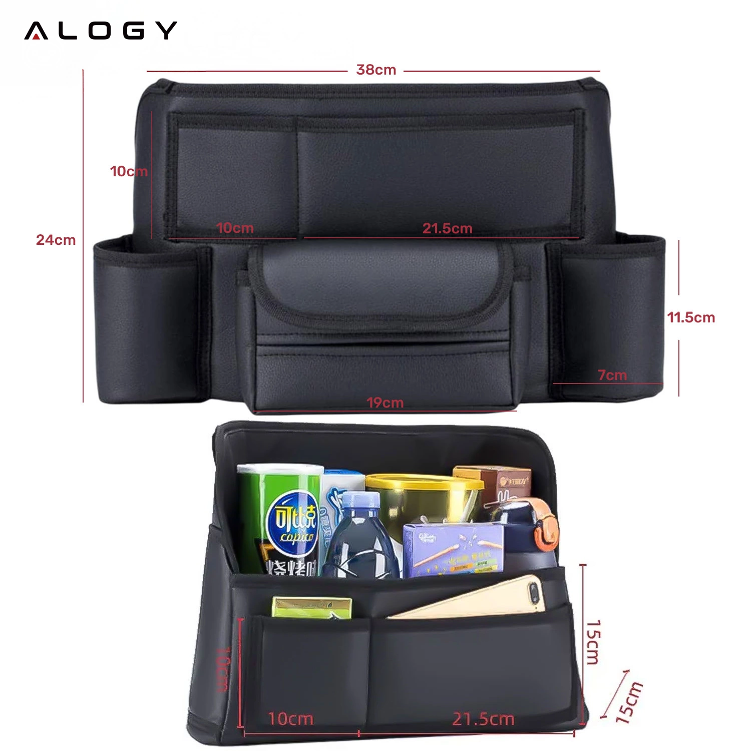 Der Organizer verfügt über bis zu 8 Taschen, darunter eine Tasche mit einer speziellen Aussparung für Taschentücher und zwei Becher-/Wasserflaschenhalter.