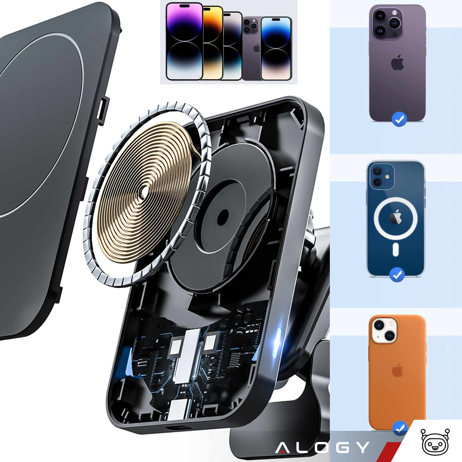 Die Halterung mit integriertem induktivem Ladegerät unterstützt die MagSafe-Technologie und ist damit mit allen Apple-Geräten kompatibel, die mit dieser Technologie ausgestattet sind.