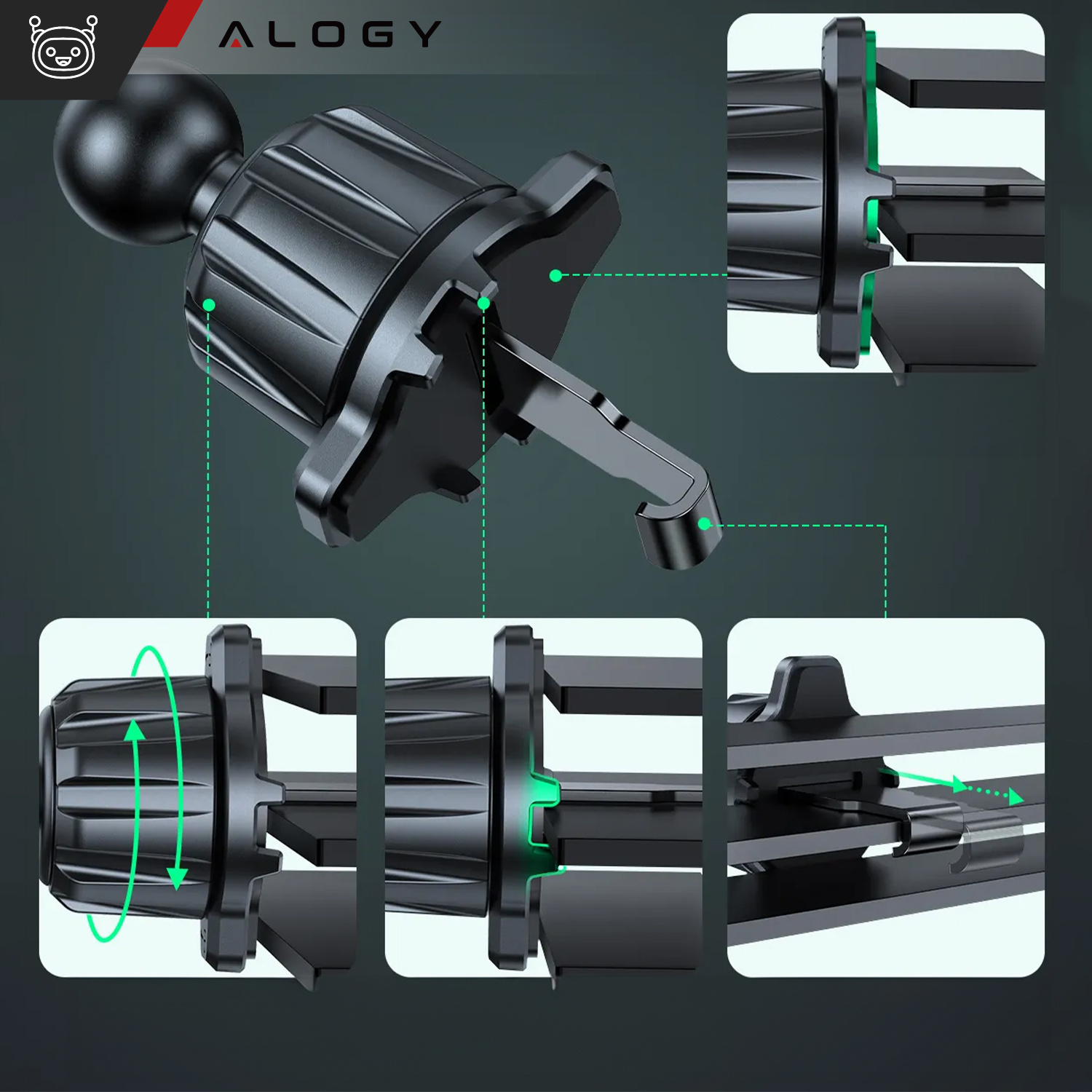 Der Markenhalter von Alogy ist mit einer praktischen Aufhängung ausgestattet , die sich problemlos an verschiedene Lüftungsgitter im Auto anpassen lässt . Dank der Drehklemme kann der Benutzer den Griff sicher befestigen und sorgt so für solide Stabilität auf Reisen.