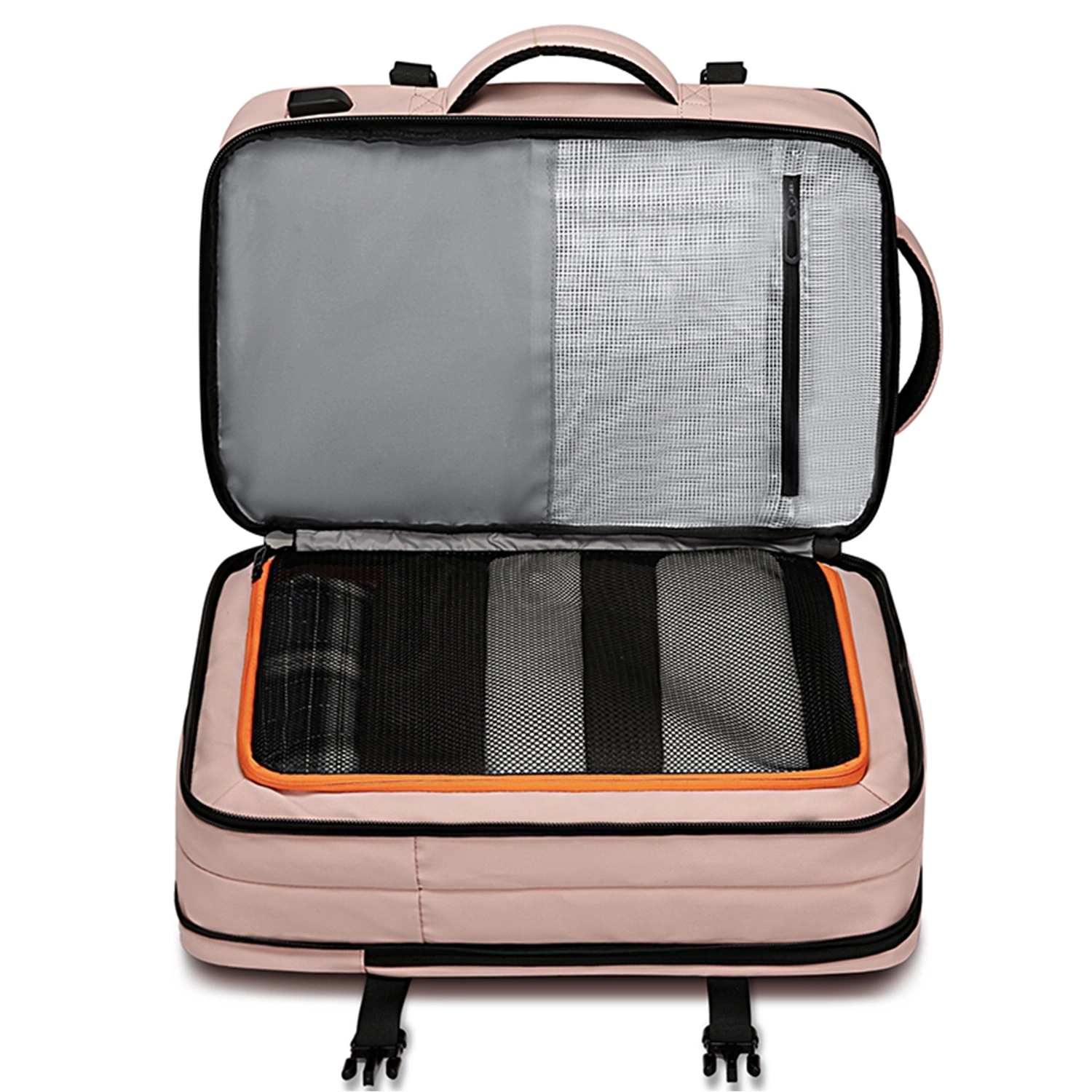 ✅ Vorderfach – es enthält mehrere Taschen, einen Stiftehalter, einen Schlüsselring und einen USB-Anschluss.