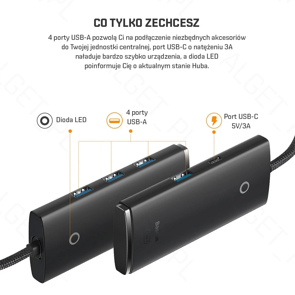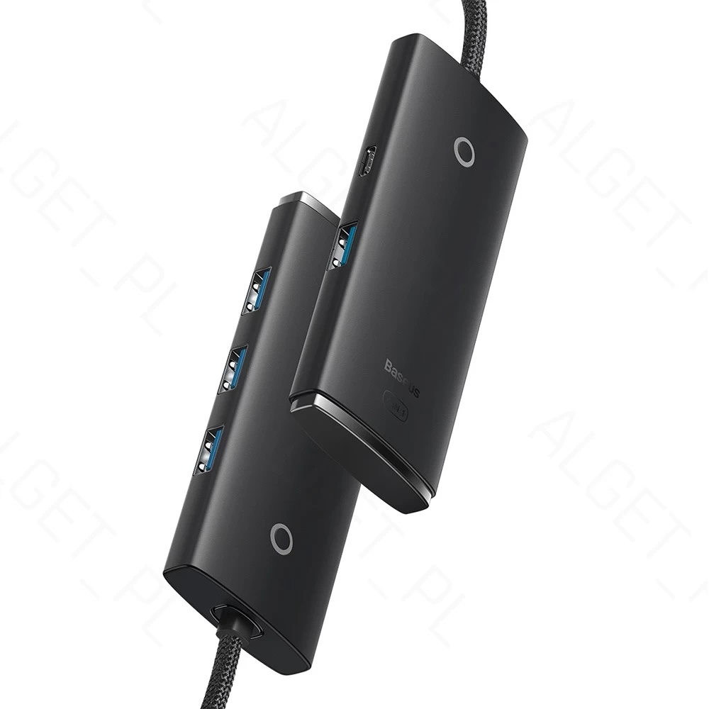 Mit dem Splitter der Baseus Lite-Serie können Sie die Anzahl der USB-A-Anschlüsse erweitern, was besonders nützlich für Geräte mit einer begrenzten Anzahl davon ist. Dank dieser Lösung können Sie die Fähigkeiten Ihres Laptops oder Computers um zusätzliche 4 USB-A 3.0-Ports erweitern. Diese Schnittstelle unterstützt Übertragungsgeschwindigkeiten von bis zu 5 Gbit / s, was eine extrem schnelle Datenübertragung mit der Möglichkeit der Übertragung von bis zu 500 MB / s ermöglicht. Das leichte Design des Adapters macht ihn zu einem großartigen Reisebegleiter. An das Zubehör können viele Geräte angeschlossen werden, wie z. B. Drucker, Kartenleser, Mobiltelefon, iPod, USB-Stick, Maus, Tastatur oder externe Festplatte (maximal 4 TB). Die Baseus-Nabe besteht aus strapazierfähigem ABS-Material, das eine lange Lebensdauer garantiert, das Kabel ist mit einem Nylongeflecht verstärkt.