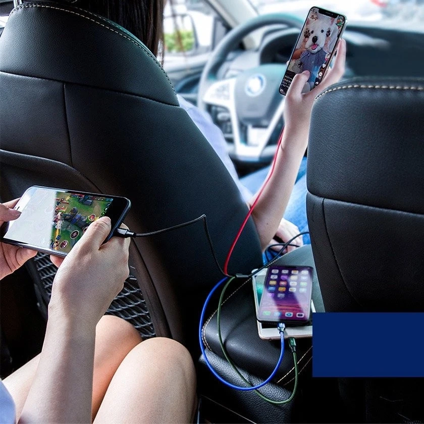 Mit dem Baseus -Kabel können Sie 4 Telefone gleichzeitig aufladen . Sie haben Lightning -Anschlüsse (Laden und Datenübertragung), 2x USB Typ C und Micro-USB (nur Laden). Sie können jedes Gerät, das mit den genannten Steckern ausgestattet ist, daran anschließen. Das Kabel ist für die Übertragung eines maximalen Stroms von 3,5 A ausgelegt, was ein schnelles Auffüllen der Energie im Akku des Telefons garantiert .