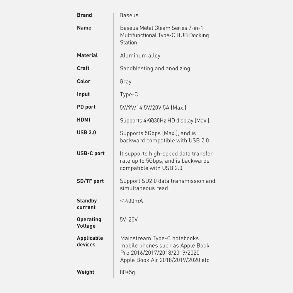 Baseus Metal Gleam Series multifunktionaler USB HUB 7in1 Typ C HDMI TF PD Kartenleser grau (WKWG020113) x 1