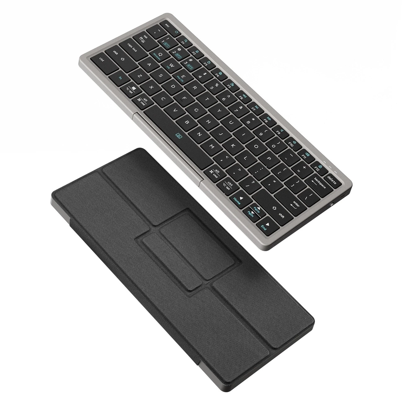 - W zestawie praktyczne etui, które chroni klawiaturę w transporcie, a po rozłożeniu służy jako podstawka pod tablet lub telefon.