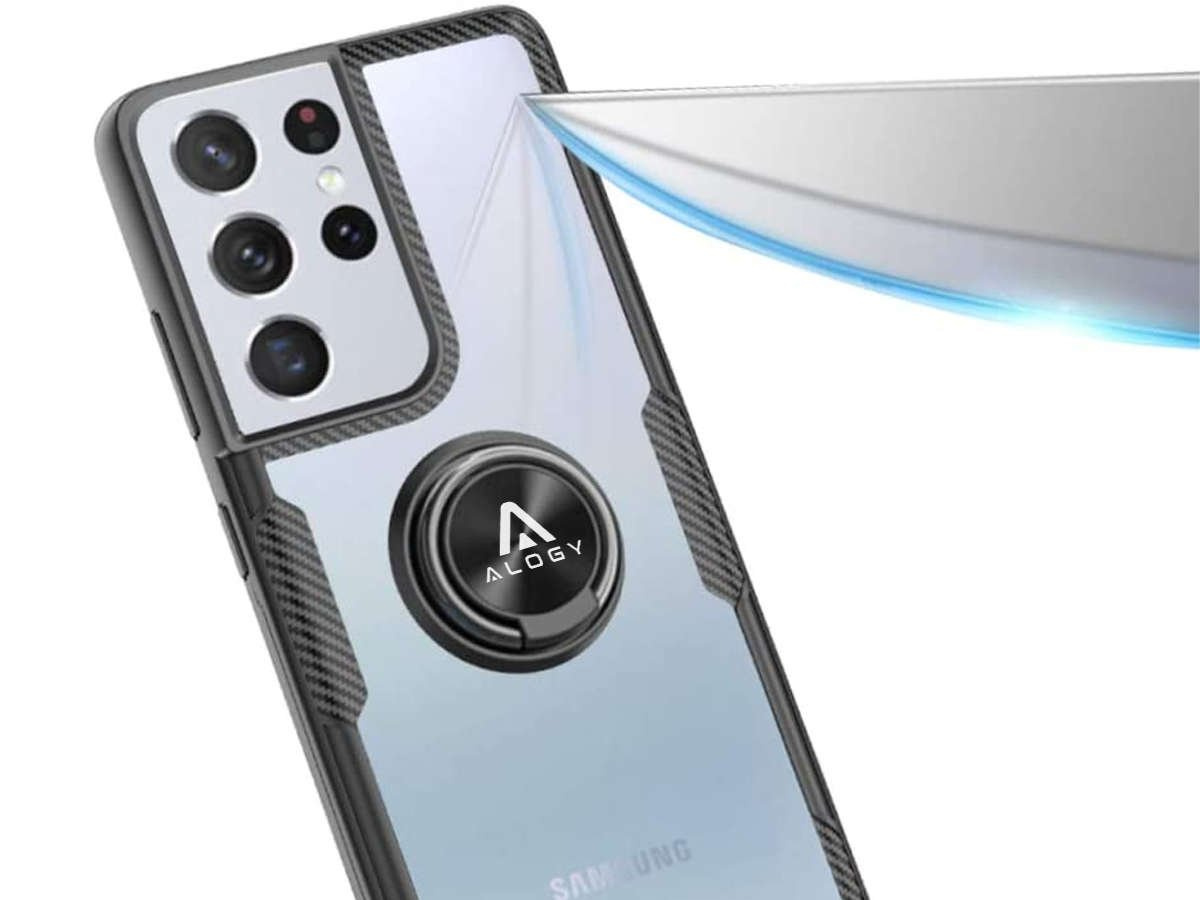 Die dem Samsung Galaxy S21 Ultra gewidmete Alogy-Ringhalterhülle ist ein Produkt, das aus einer Kombination von zwei hochwertigen Materialien besteht; flexibles TPU und haltbares Polycarbonat.