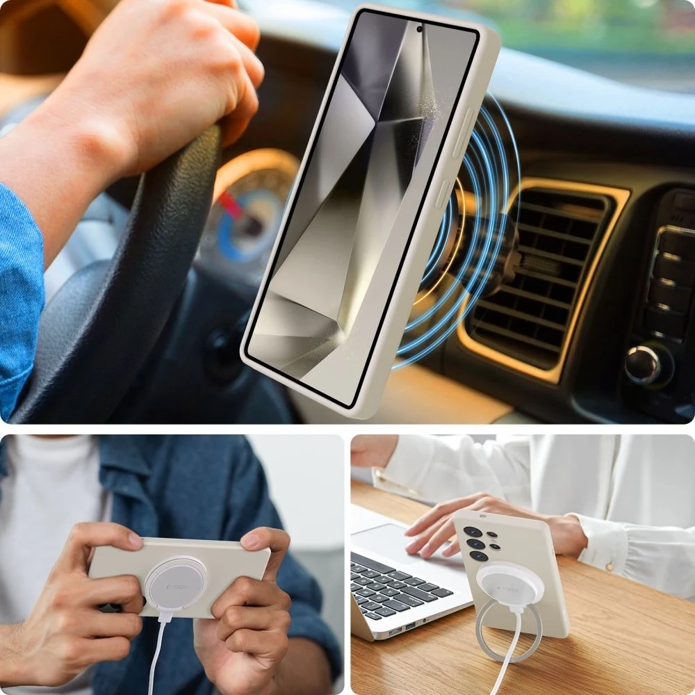 Etui Tech-Protect Liquid Silicone MagSafe do Samsung Galaxy S25 Ultra w odcieniu Cosmic Latte to propozycja dla osób, które chcą połączyć subtelną estetykę z funkcjonalną ochroną. Miękka w dotyku powierzchnia, smukła konstrukcja i pełna zgodność z MagSafe czynią z niego idealny dodatek do codziennego użytku.