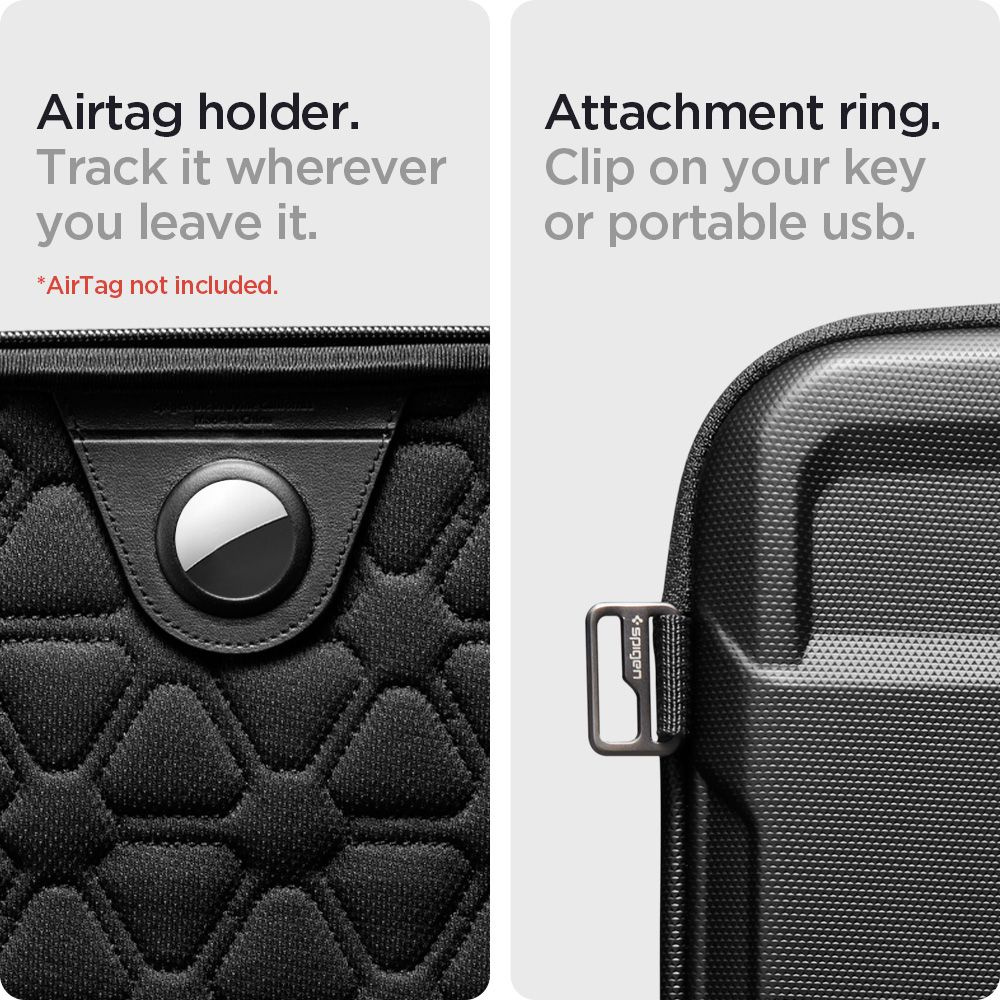 Die Hülle ist mit elastischen Riemen ausgestattet, die den Laptop auch während der Verwendung sichern, und eine spezielle Apple Airtag-Verriegelung ermöglicht es Ihnen, das Gerät an einem sicheren Ort zu verstecken.