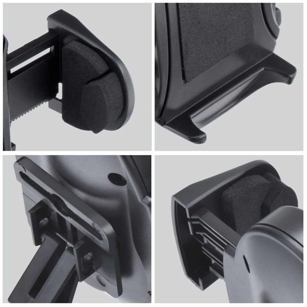 Der Klemmmechanismus mit Druckknopf ermöglicht Ihnen, Ihr Telefon schnell und sicher in der Halterung zu platzieren. Der Armabstand von 38–107 mm passt für die meisten Smartphones und Navigationsgeräte, und die Bodenstützen verhindern ein versehentliches Herausnehmen des Geräts. Weicher Schaumstoff schützt das Telefon vor Kratzern, und starke Klemmen sorgen für Stabilität auch bei Stößen.