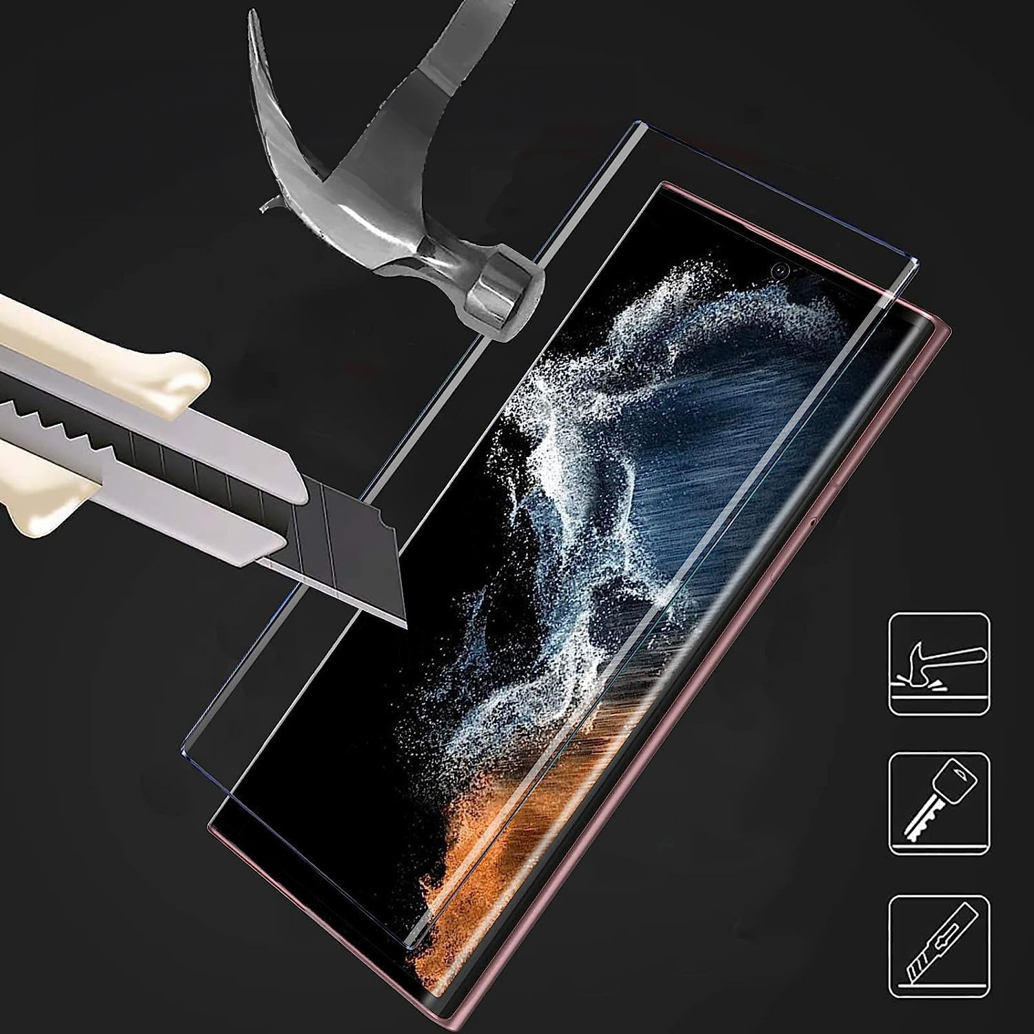 UVTG wird mit einer flüssigen Substanz auf die gesamte Oberfläche des Bildschirms geklebt und die Substanz dann mit einer UV-Lampe ausgehärtet. Dank dieser Kombination erhalten wir den perfekten Effekt von Glätte, Klarheit und Reaktionsfähigkeit auf einem gekrümmten Bildschirm.