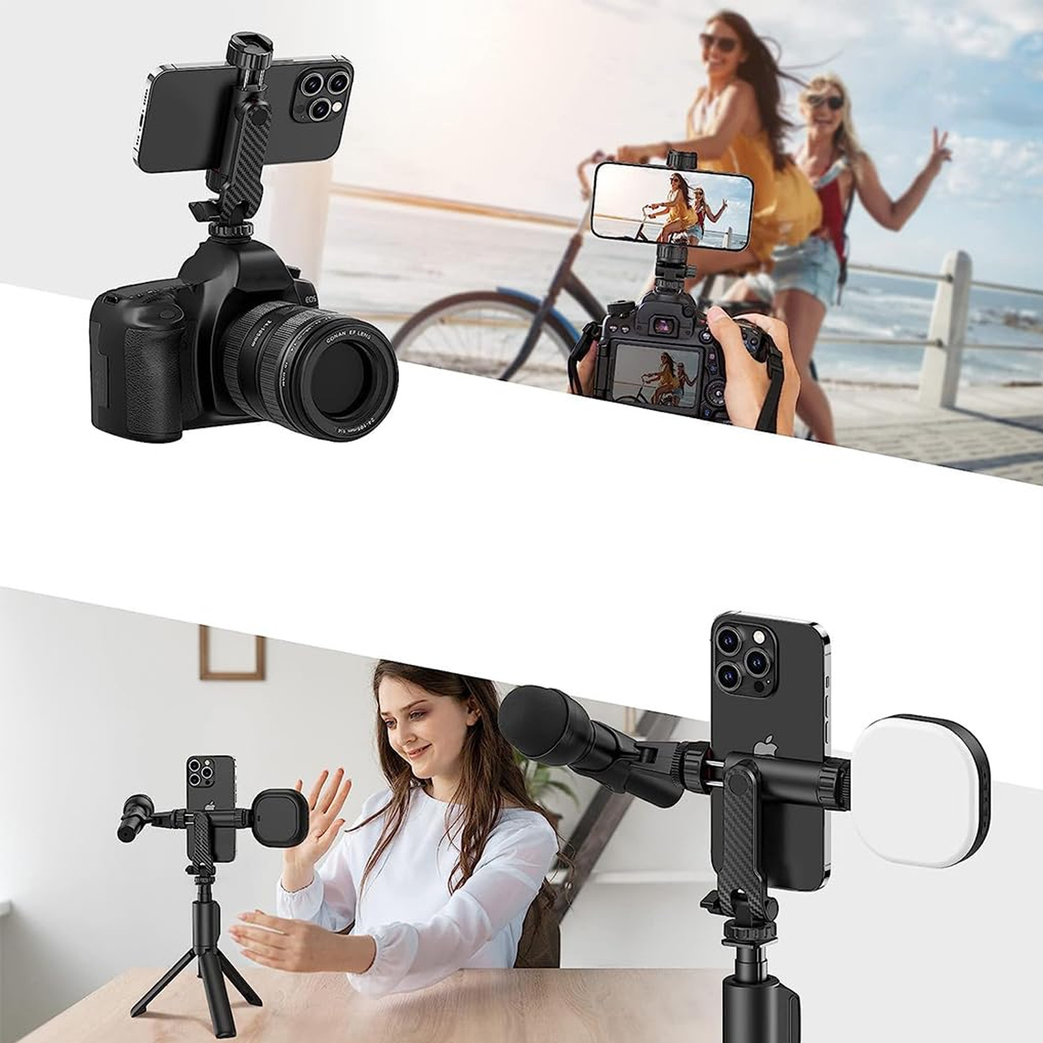 Die Halterung wird im Urlaub und auf Touristenreisen nützlich sein, wenn wir Reisematerial fotografieren oder Live-Berichte von Reisen erstellen müssen. Zusätzliche seitliche Halterungen auf beiden Seiten ermöglichen die Montage z.B. eines Mikrofons oder einer Taschenlampe (nicht im Lieferumfang enthalten).