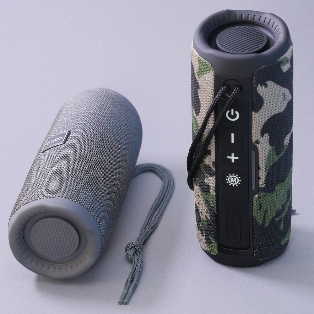 • Tragbarer HOCO HC16 Bluetooth-Lautsprecher mit 2x5W Leistung und Camouflage-Design. Kompakt, ideal für den Outdoor- und Alltagsgebrauch. Unterstützt Bluetooth, FM, USB, TF, AUX. 1200 mAh Akku – bis zu 3 Stunden Musik.