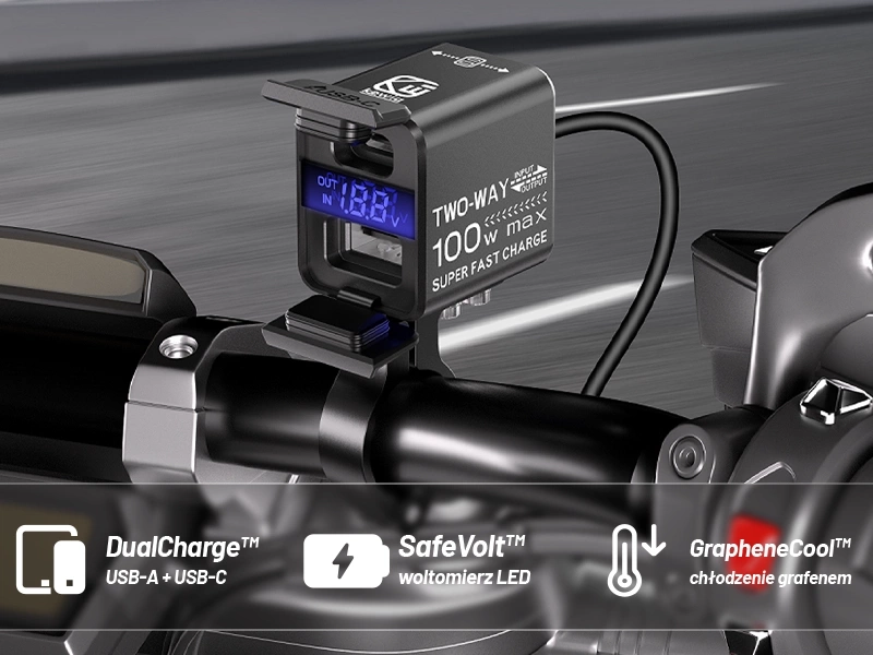 ✅ PowerReverse™ – bidirektionale Technologie, mit der Sie nicht nur Ihr Telefon, sondern auch Ihre Motorradbatterie über USB-C aufladen können.