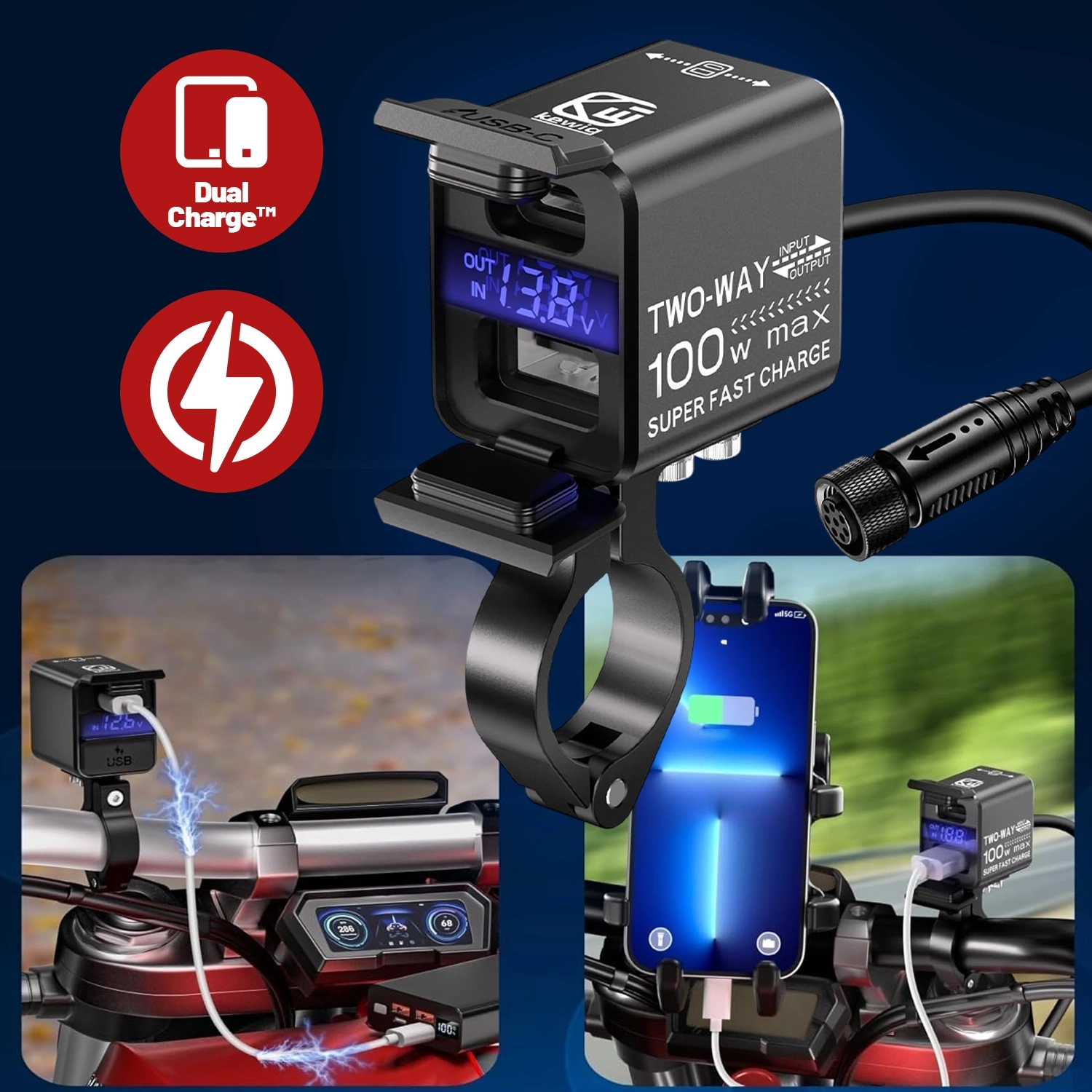 Kewig Motorradladegerät, universelles Aluminium-Ladegerät, 100 W, bidirektional mit Voltmeter, Schnellladefunktion über USB-A und USB-C, intelligent und wasserdicht – Schwarz x 1