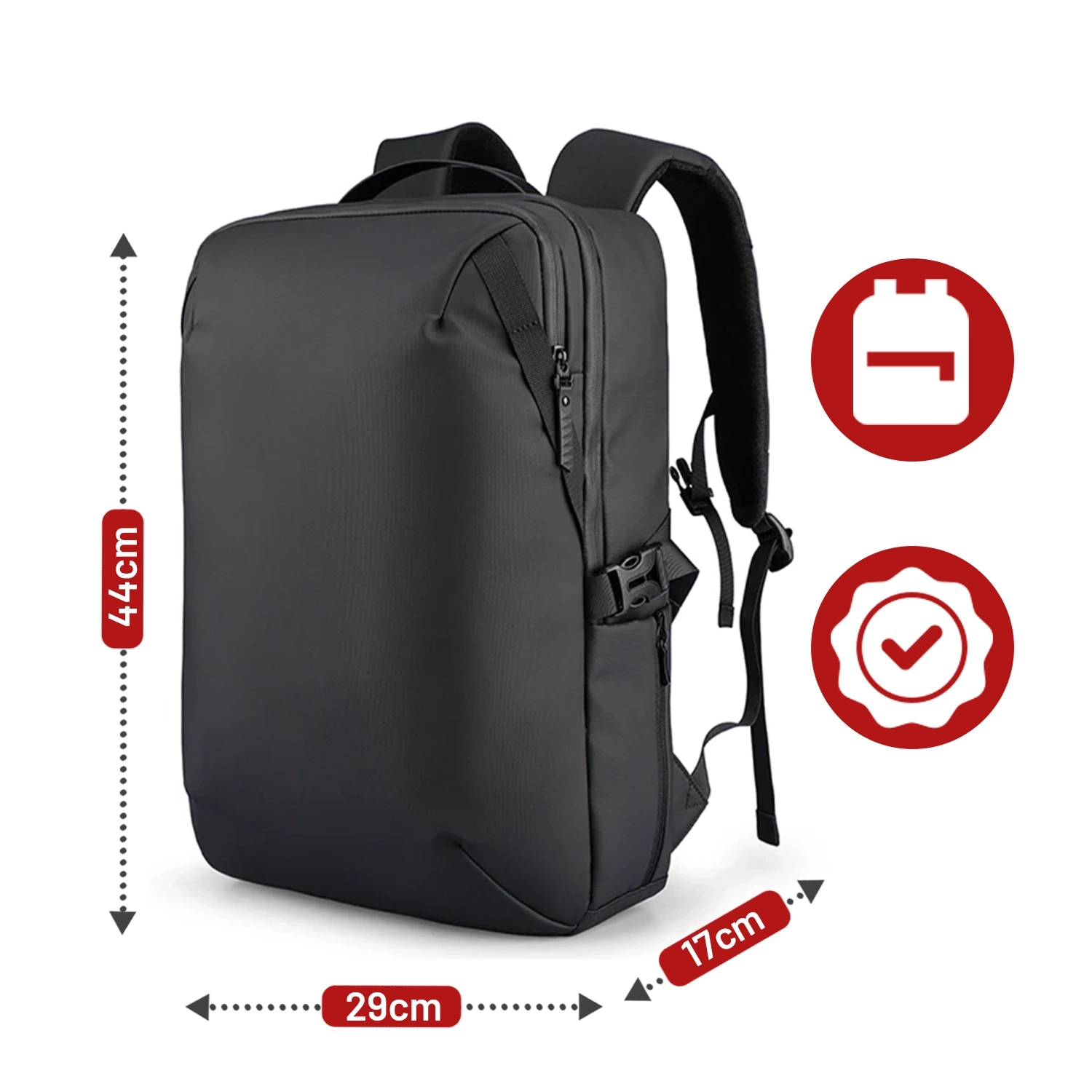 Der Rucksack misst 44 × 29 × 17 cm (+/- 2 cm) und eignet sich perfekt als Handgepäck im Flugzeug (kostenpflichtige Version) . Nutzen Sie ihn auf Ihrer nächsten Reise mit beliebten Fluggesellschaften wie: