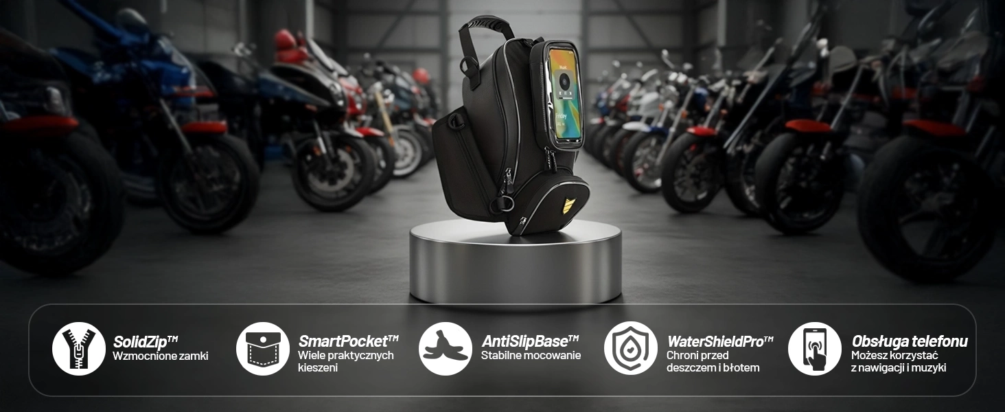 Diese Motorradtasche mit integrierter Handyhülle löst dieses Problem und ermöglicht Ihnen die volle Kontrolle über Ihr Smartphone, selbst bei Regen . Dank TouchSafe™-Technologie funktioniert der Bildschirm auch durch die Schutzfolie hindurch, und die Montage am Tank mit dem QuickMount™-System ist kinderleicht . Im Inneren finden Handschuhe, Dokumente, eine Powerbank und andere wichtige Dinge Platz. Bei Bedarf lässt sich die Tasche in eine praktische Handtasche verwandeln . Sie ist die perfekte Lösung für Motorradfahrer, die Sicherheit, Funktionalität und Stil vereinen möchten – egal ob auf dem Weg zur Arbeit oder auf der Straße.