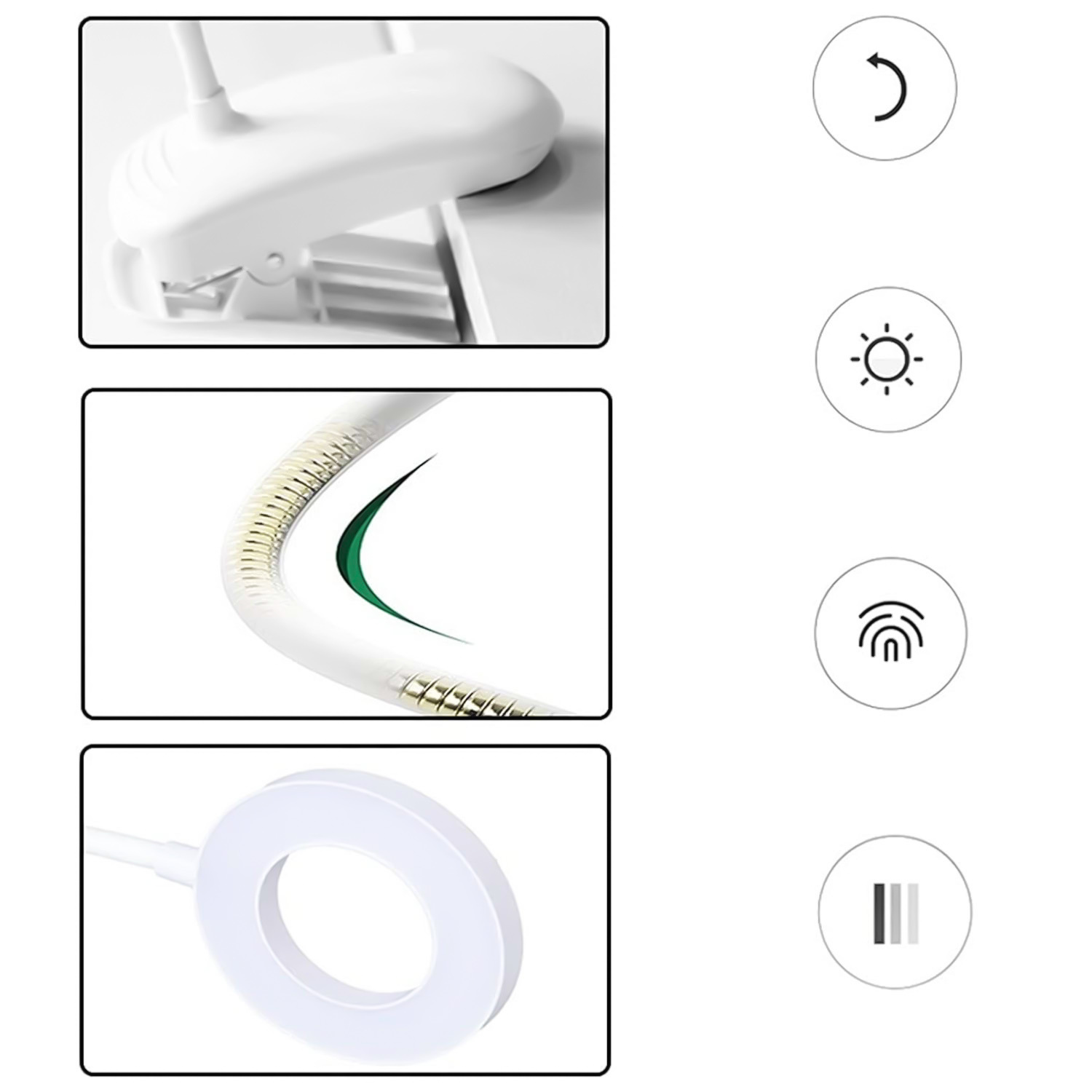 Eine universelle LED-Lampe mit Clip, die sich ideal für den Schreibtisch, das Bett oder beim Arbeiten am Computer eignet. Die Lampe verfügt über einen integrierten Knopf, mit dem Sie die Lichtintensität mit einem Klick ändern können.
