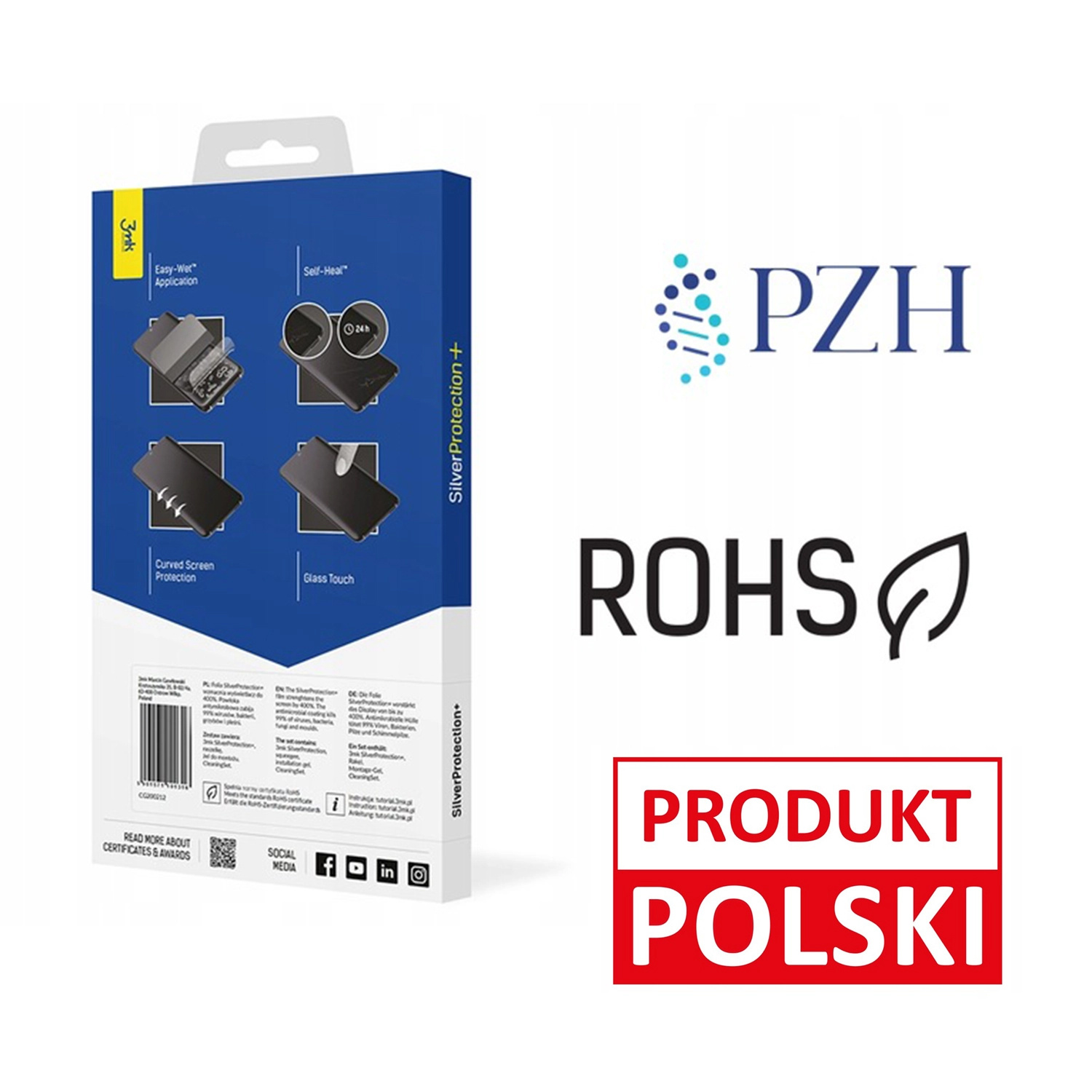 Die SilverProtection-Bildschirmfolie von 3mk verfügt über die folgenden Zertifikate: Polnisches Produkt, RoHs- und PZH-Zertifikat.