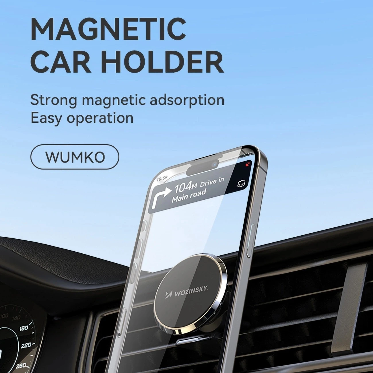 Wozinsky WUMKO to kompaktowy, magnetyczny uchwyt samochodowy, który zapewnia pewność trzymania telefonu w każdych warunkach drogowych. Montowany do kratki nawiewu, nie ogranicza widoczności i oferuje intuicyjną obsługę jedną ręką – bez rozpraszania podczas jazdy.