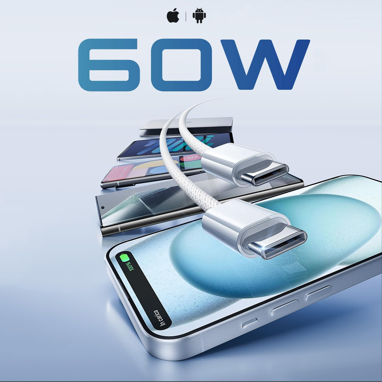 Das 60-W-USB-C-zu-USB-C-Kabel ermöglicht das vollständige, schnelle und sichere Laden von Geräten und die Datenübertragung.