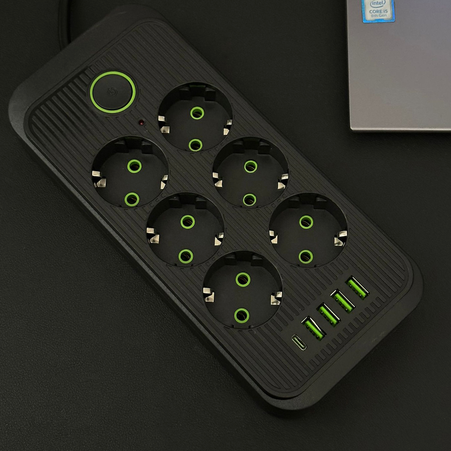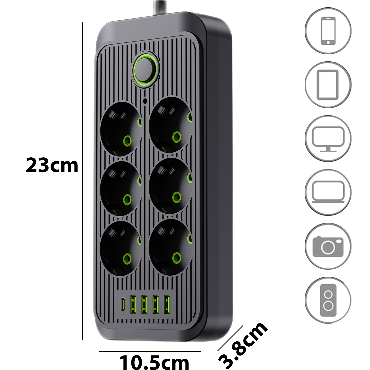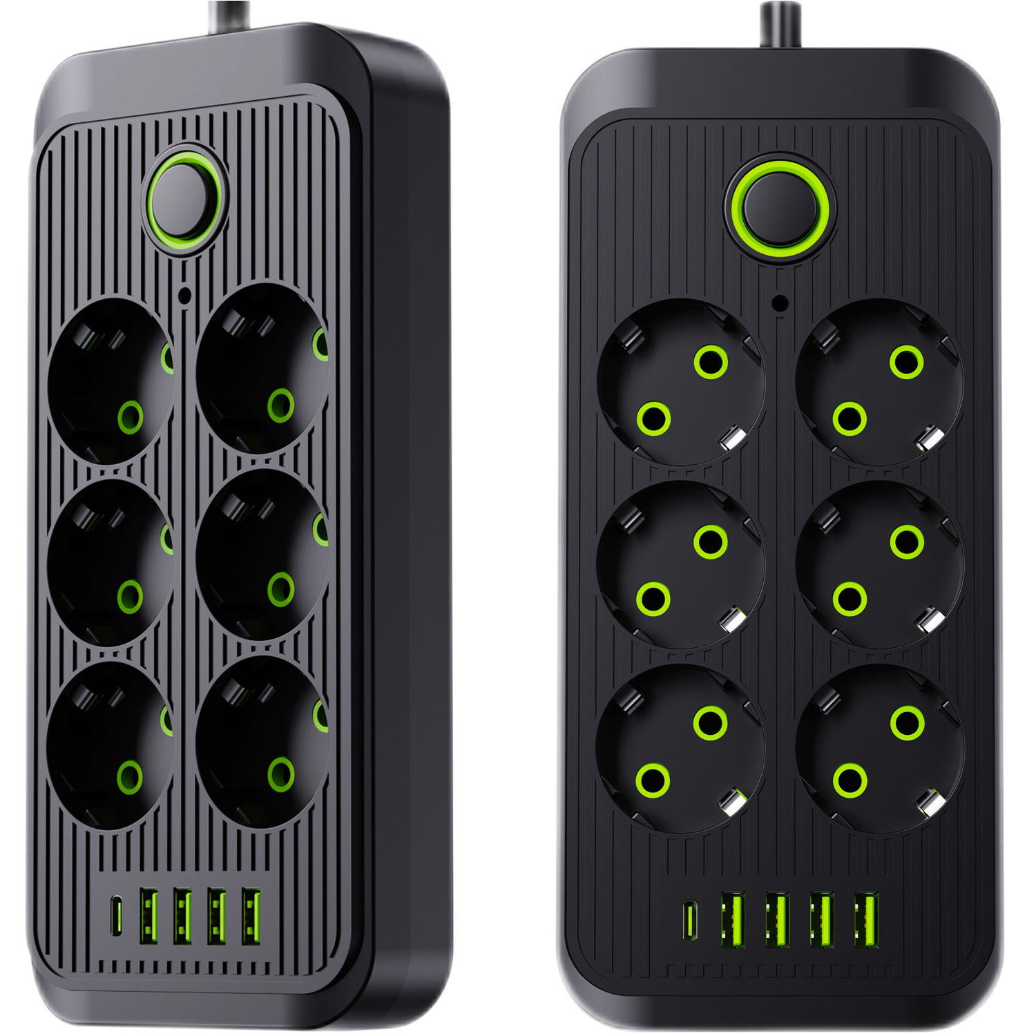 Verlängerungskabel Steckdosenleiste 6 Steckdosen AC EU-Steckdosen 4x USB USB-C Typ C-Steckdosen 2500 W Schwarz x 1