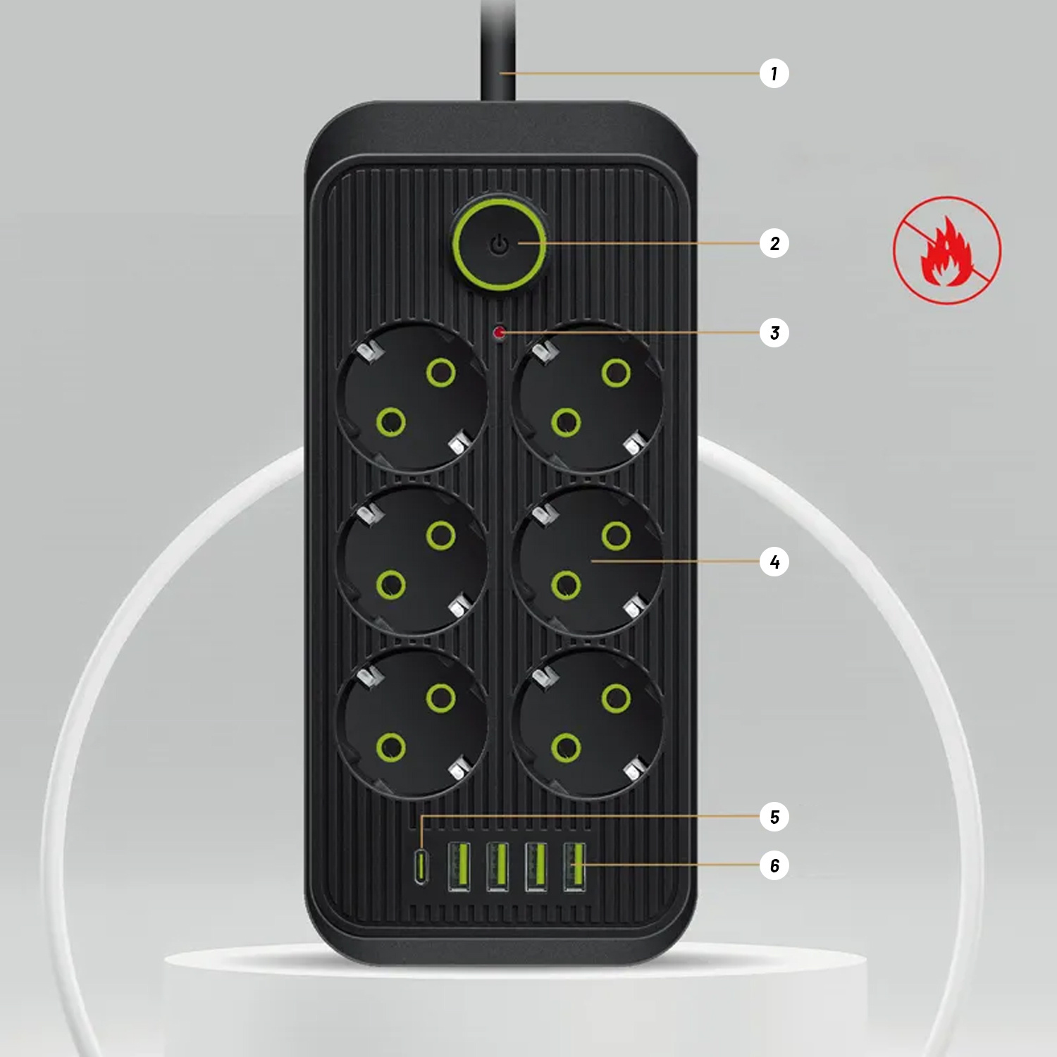 Die Hauptmerkmale dieses Verlängerungskabels sind sechs herkömmliche EU-Buchsen, vier USB-Anschlüsse, ein USB-C-PD-Anschluss, eine Kabellänge von 2 Metern, ein Schalter und eine LED.