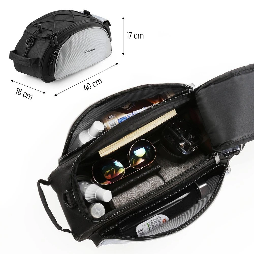 Multifunktional, angenehm zu tragen, geräumig – das ist die Fahrradträgertasche von Wozinsky. WBB1BK ist ein Modell für alle, die die Stadt gerne mit dem Fahrrad erkunden. Die Tasche hat einen langen Riemen, der es sehr bequem macht, die Tasche über der Schulter zu tragen . Die Kofferraumtasche hat ein Fassungsvermögen von bis zu 13 Litern und bietet somit Platz für die Dinge, die Sie für einen Wochenendausflug benötigen . Darüber hinaus ist die Fahrradtasche wasserabweisend, langlebig und nachts sichtbar – dank der reflektierenden Oberfläche.