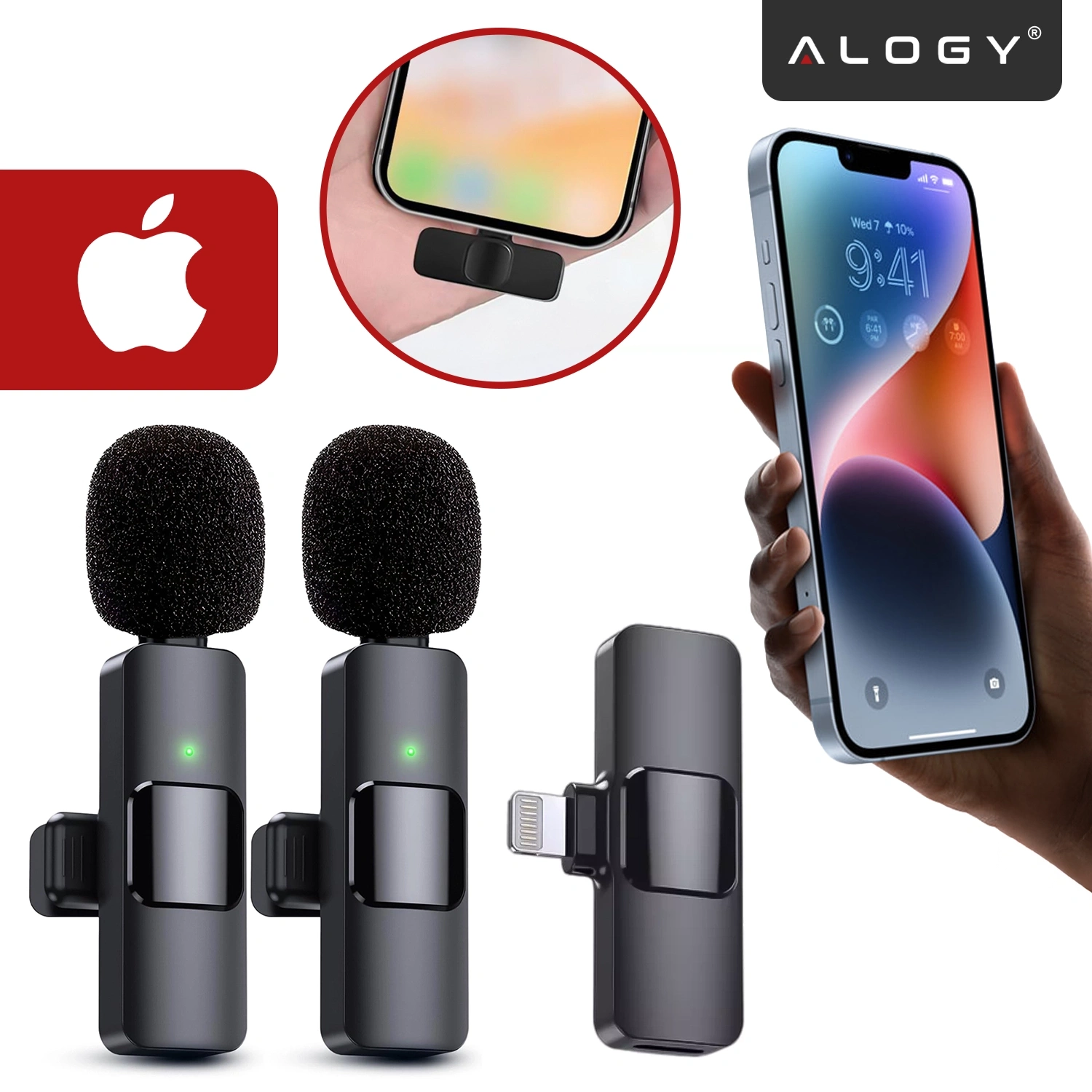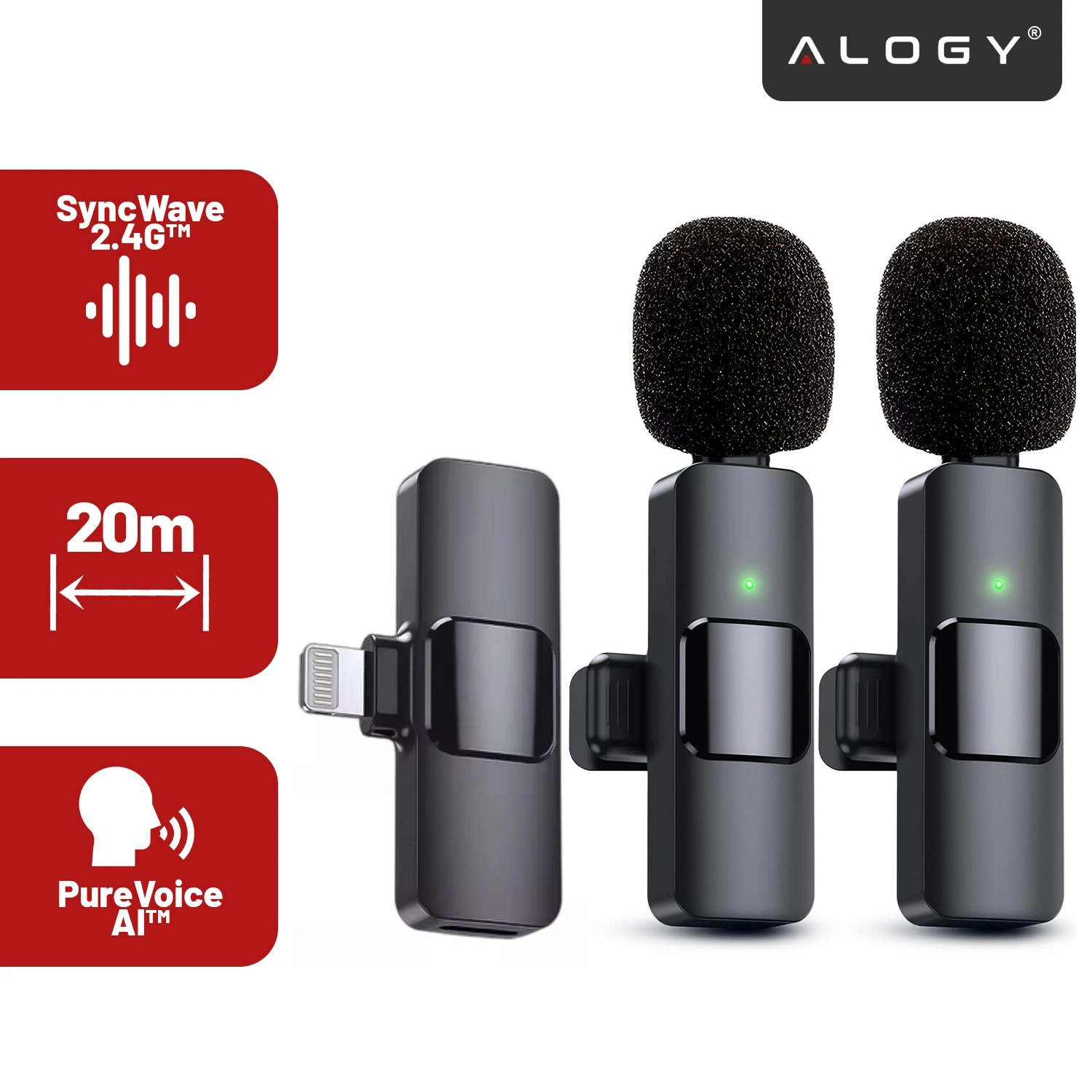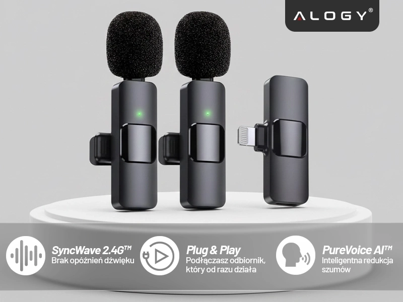 ⭐ Najnowszy model ⭐ Certyfikat CE i FCC ⭐ 2x Mikrofon ⭐ Złącze Lightning ⭐ Plug&Play - podłącz i nagrywaj ⭐ 20m zasięgu ⭐ 6h pracy ⭐ PureVoice AI™ – Inteligentna redukcja szumów ⭐ SyncWave 2.4G™ – Brak opóźnień dźwięku ⭐10 lat doświadczenia w branży ⭐ ponad 50.000 zadowolonych klientów marki Alogy ⭐
