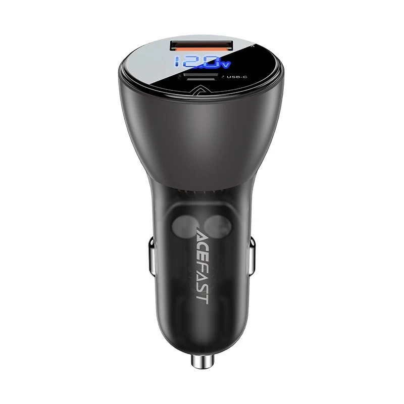 Szybka ładowarka samochodowa marki Acefast. Posiada 2 porty, USB Typ C i USB. Pierwsza wtyczka USB Typ C