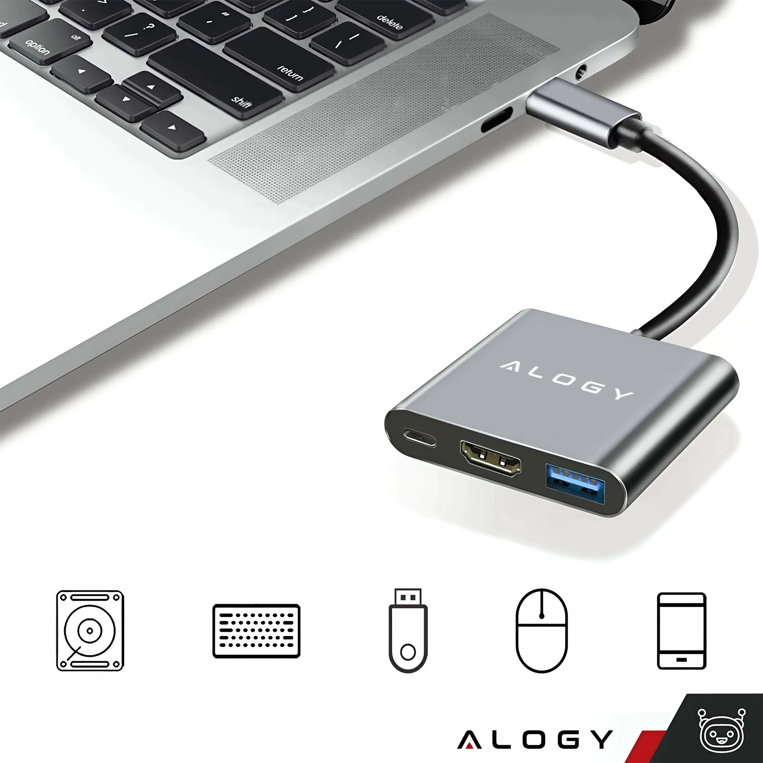 Adapter przejściówka HUB 3w1 USB-C na HDMI USB-A USB-C 4K 60Hz Alogy szary x 1