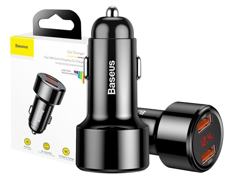 Ładowarka Baseus posiada wyświetlacz LED, na którym wyświetlane jest aktualne napięcie oraz natężenie ładowania, dzięki czemu jesteśmy informowani z jaką mocą ładowany jest nasz sprzęt. Dodatkowo na wyświetlaczu jest również informacja o napięciu jaką otrzymuje urządzenie od akumulatora samochodowego, co umożliwia szybką diagnostykę i wykrycie problemu. W czasie odpalania auta wartość powinna mieścić się w przedziale od 13.3V do 14.8V, podczas normalnego ładowania wartość ta wynosi od 12V do 13.2V, w przypadku niższej wartości należy sprawdzić stan baterii. (informacje wyświetlane są na wyświetlaczu po sobie, każda kategoria zmienia się co 5 sekund). Ładowarka została również wzbogacona o inteligentny podwójny układ zarządzania (inteligentny chip x2), który odpowiedzialny jest za każdy port. Chip dopasowuje optymalne napięcie do konkretnego sprzętu, tak aby czas ładowania był najkrótszy bez ryzyka uszkodzenia baterii.
