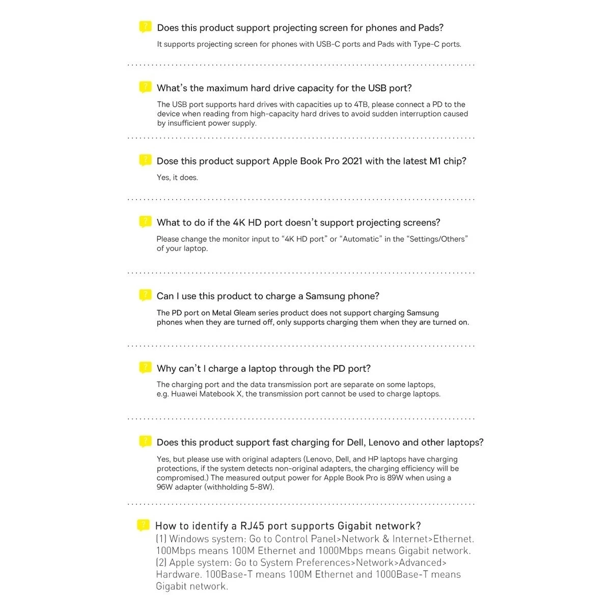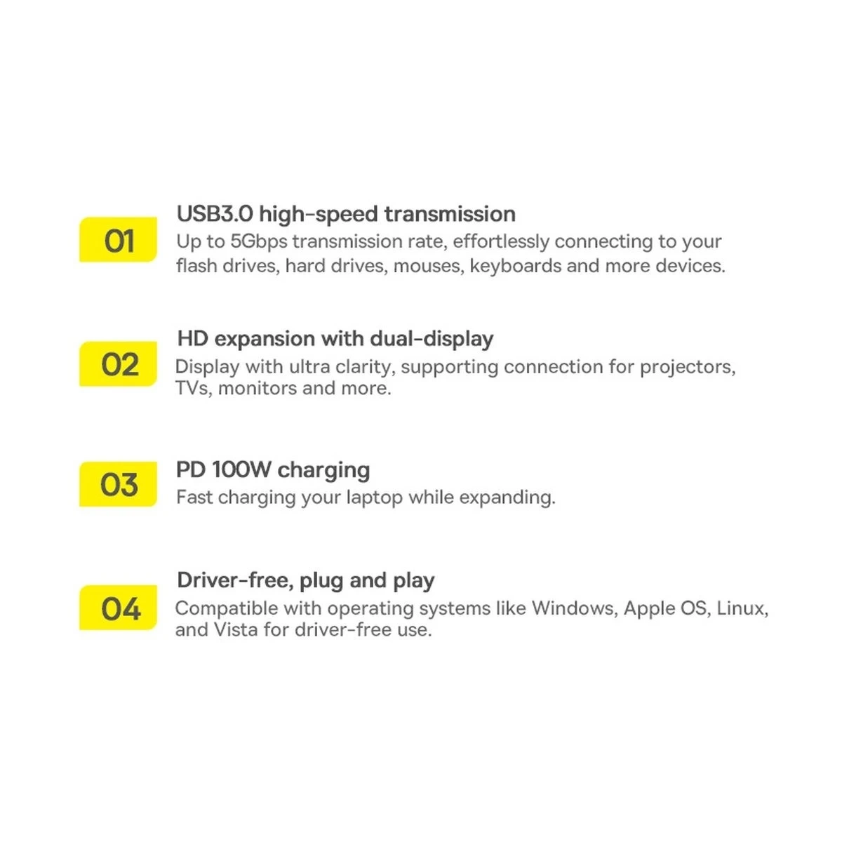Gadżet od marki Baseus pozwoli Ci na w pełni swobodną pracę lub zabawę. Wszystko dzięki dużej liczbie dostępnych portów oraz gniazd. Nowe laptopy często nie mają wystarczającej ilość gniazd USB lub HDMI. Dzięki HUBowi Baseus nie musisz się martwić ich brakiem. Dodatkowo znajdziesz w nim port Ethernet RJ-45 oraz VGA.