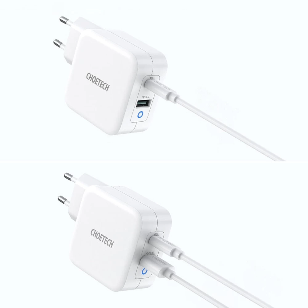 Ładowarka, która zasili nie tylko telefon, ale także tablet czy laptop i do tego może ładować dwa urządzenia na raz? To musi być Choetech PD8002! Ta ładowarka sieciowa ma wbudowane dwa porty: USB (max 18 W) i USB Typ C (max 65 W). Przy podłączeniu urządzeń do obu portów Choetech PD8002 będzie je ładować łączną mocą do 63 W (45 W + 18 W). Dzięki podzespołom GaN ładowarka jest wydajna, mocna i szybka. Posiada też dwa standardy szybkiego ładowania: Quick Charge i Power Delivery. Niestraszne jej żadne wyzwania!