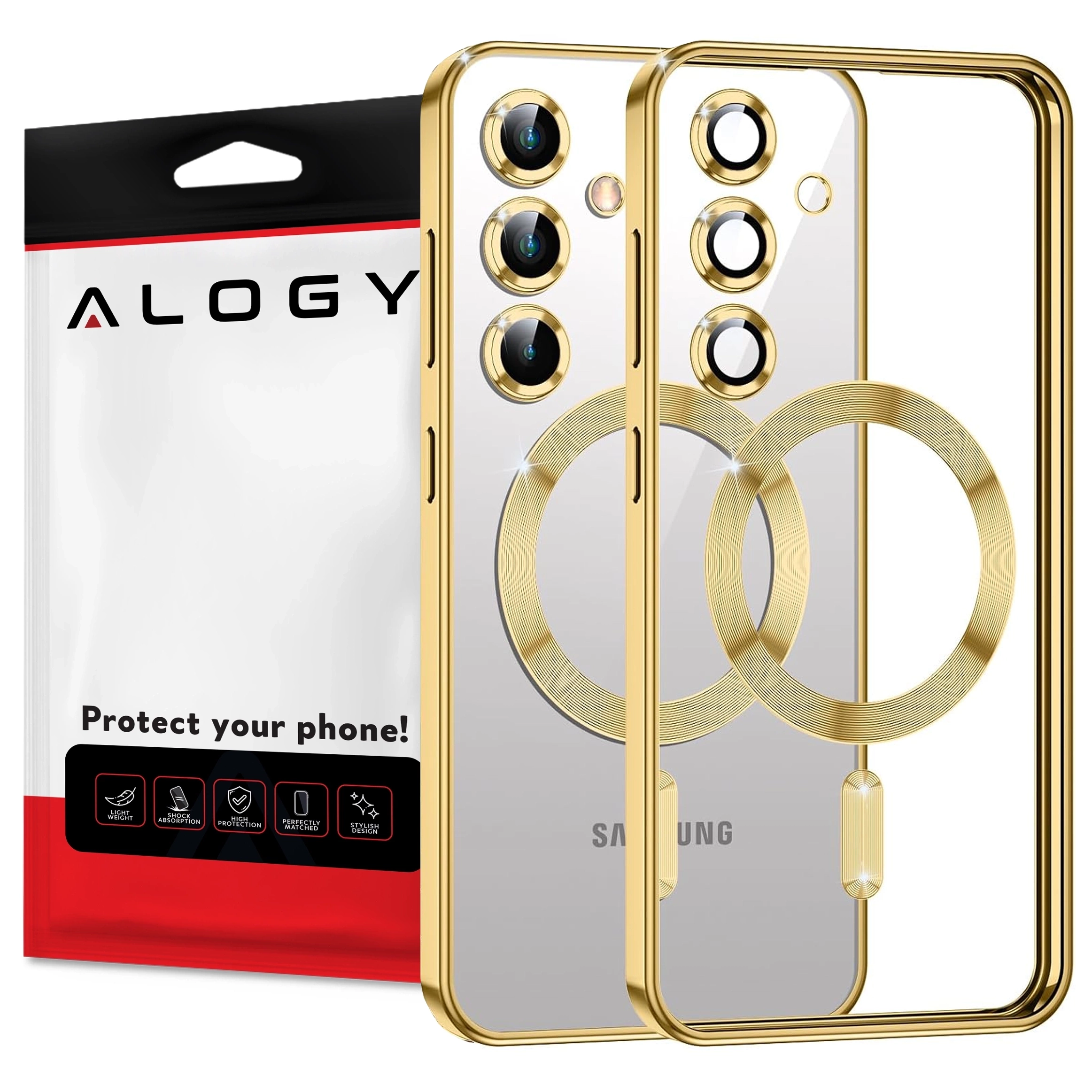 ✅ Etui Alogy LuxeShield™️ MagSafe Glamour Case dedykowane do Samsung Galaxy S25+ Plus oferuje ochronę klasy premium i perfekcyjne dopasowanie dzięki elastycznej ramce z poliuretanu. Złote wykończenie nadaje elegancji, skutecznie chroniąc aparat i obiektywy, a smukły design nie pogrubia telefonu.