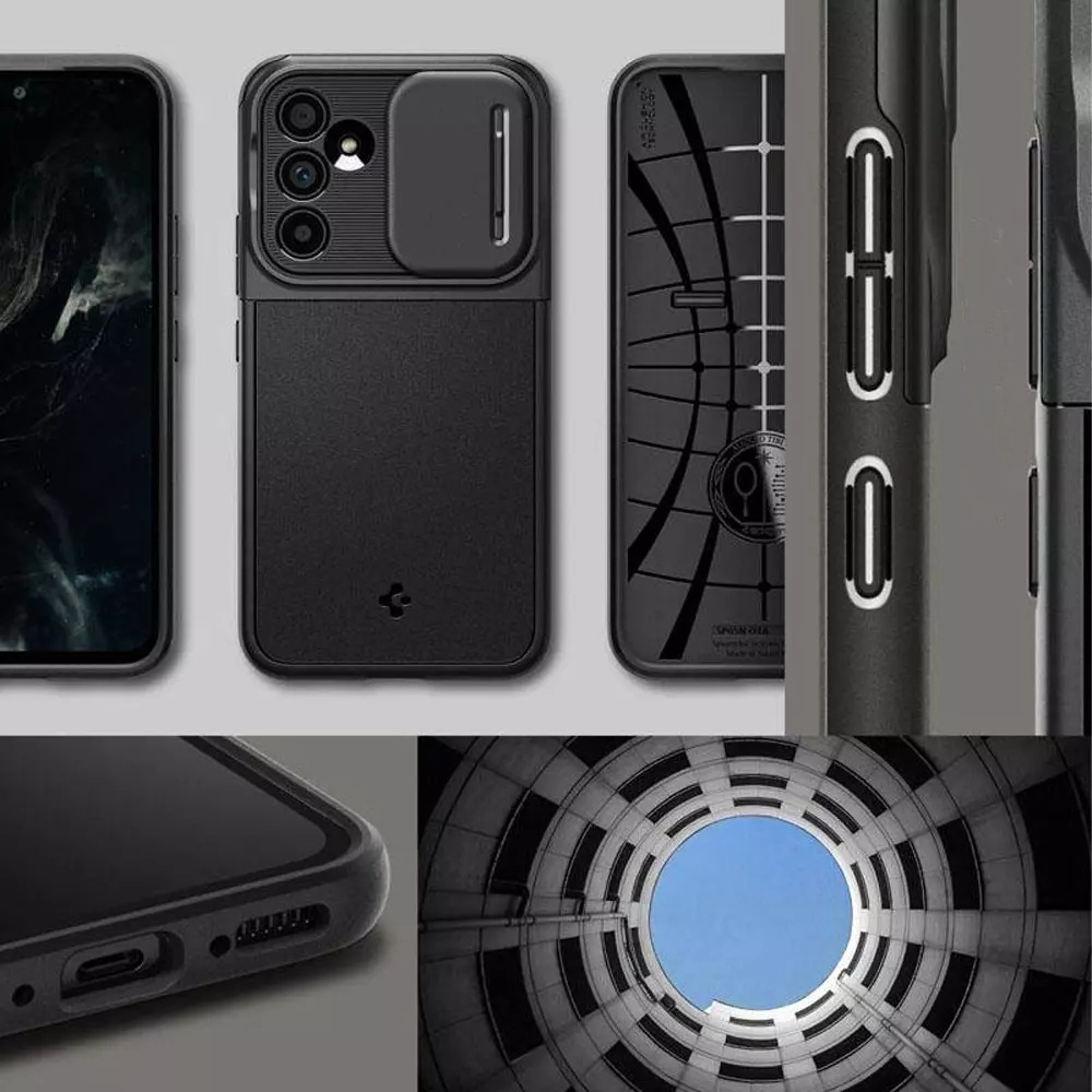 Etui z serii Optik Armor wyprodukowane przez renomowaną firmę Spigen zostało idealnie dopasowane do Samsung Galaxy A54 5G. Pokrowiec charakteryzujące się mocną, poliwęglanową osłoną na wyspę aparatów urządzenia z przesuwnym panelem, pozwalającym na całkowite zakrycie sekcji obiektywów dla jeszcze większej ochrony kamer.