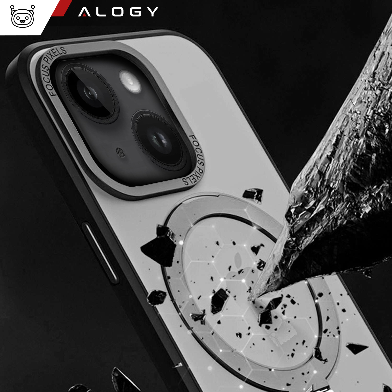 Etui Alogy MagSafe wykonane zostało z połączenia poliwęglanu i poliuretanu, które bezpiecznie okalają telefon i jego obiektyw. Elastyczny poliuretan, wykorzystany do produkcji pokrowca, idealnie przylega, nie zwiększając znacząco wymiarów urządzenia.