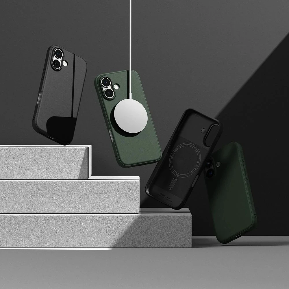 Etui z serii Onyx Magnetic Magsafe od firmy Ringke wykonane jest z miękkiego i wytrzymałego tworzywa termoplastycznego, dodatkowo wzmocnionego na krawędziach by jak najlepiej chronić urządzenie. Nieco podniesiona forma obudowy wokół aparatu i ekranu chroni go przed zarysowaniami, unosząc telefon tuż nad powierzchnią płaską. Posiada osłony na przyciski, wycięcia na porty i smycz.