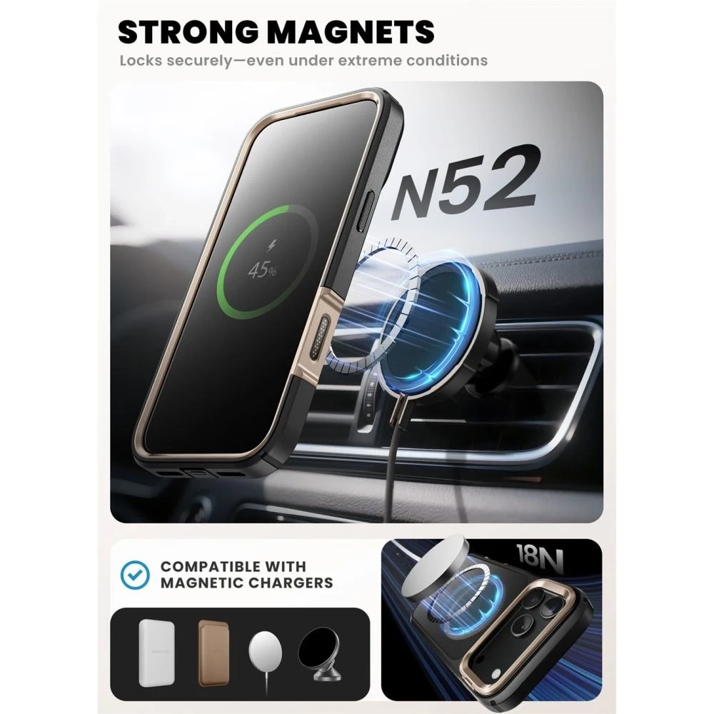 • Supcase Ares Flip Mag do iPhone 17 Pro Max w kolorze Desert Gold to etui pancerne z certyfikatem MIL-STD 810G. Chroni 360°, ma wbudowaną szybkę, podstawkę przy aparacie i pełną kompatybilność z MagSafe.