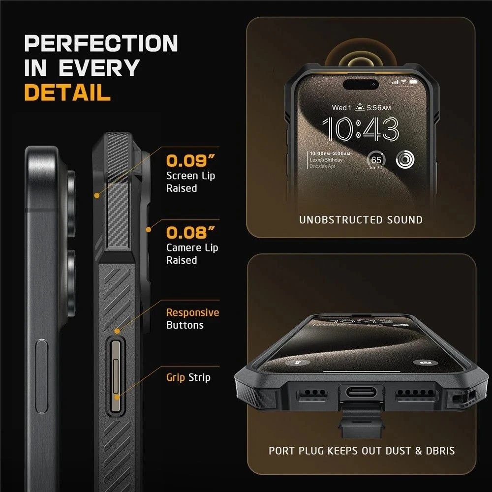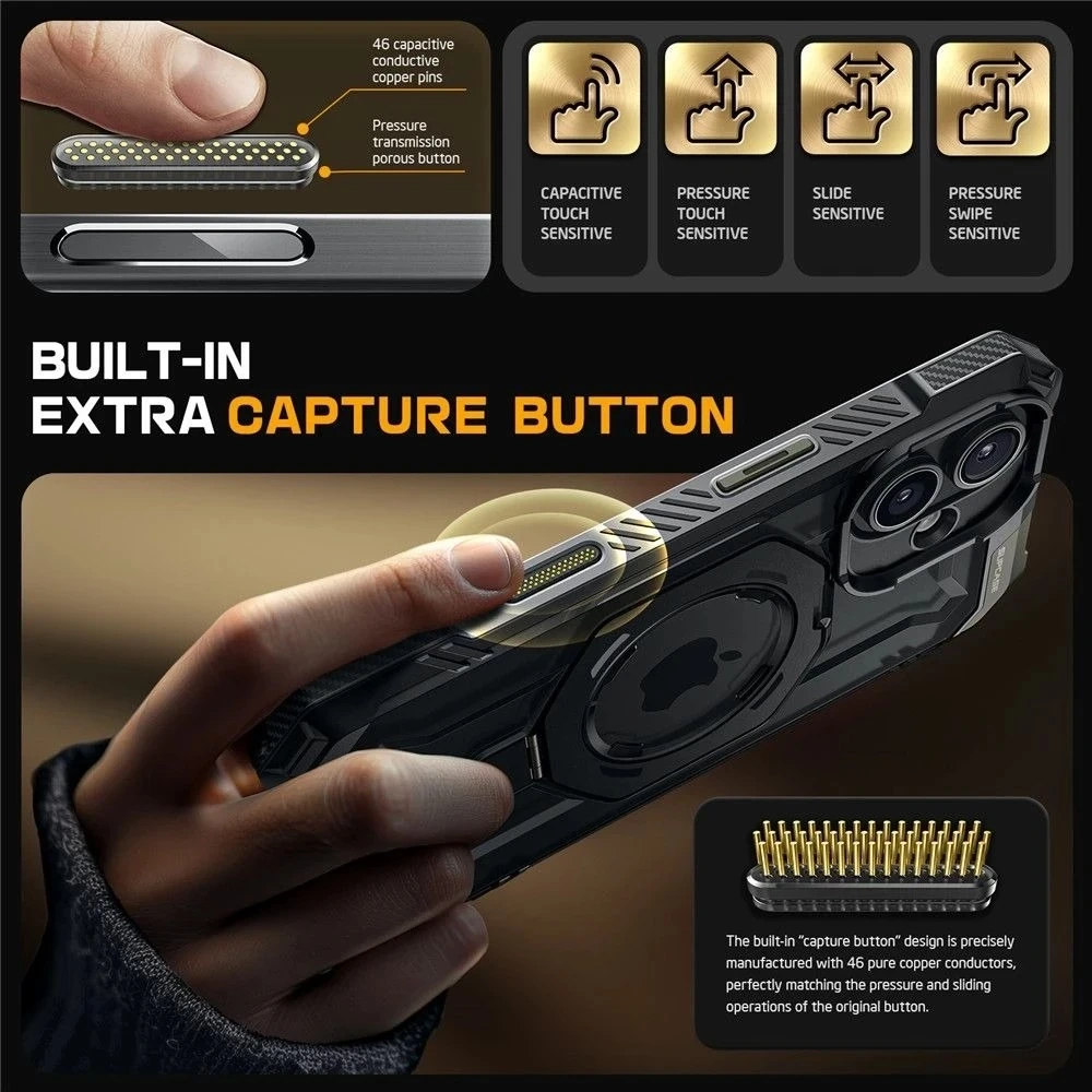 Supcase UB Grip Magsafe to etui, które łączy w sobie wytrzymałość, funkcjonalność oraz elegancki design. Wykonane z odpornego na uderzenia materiału TPU, posiada wzmocnione narożniki, które zapewniają ochronę przed upadkami zgodnie z normami wojskowymi MIL-STD 810G (do 15 stóp). Plecki etui są przezroczyste i matowo-czarne, co nadaje urządzeniu nowoczesny wygląd, jednocześnie chroniąc telefon przed zarysowaniami.