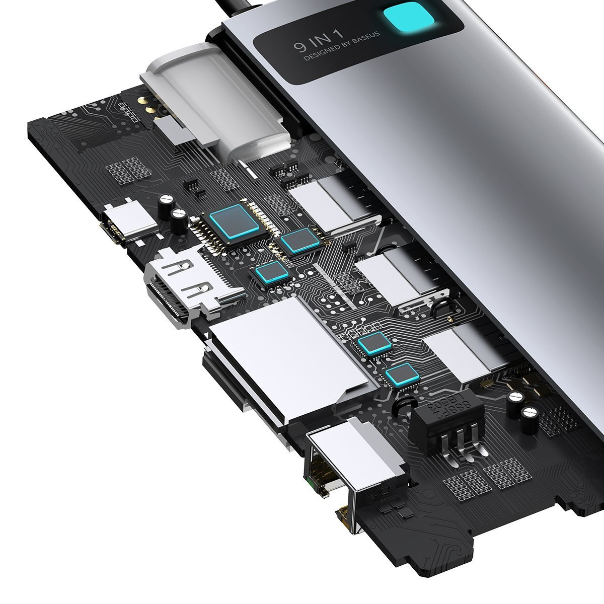 Hub 9w1 Baseus Metal Gleam Series, USB-C do 3x USB 3.0 + HDMI + USB-C PD + Ethernet RJ45 + microSD/SD + VGA x 1