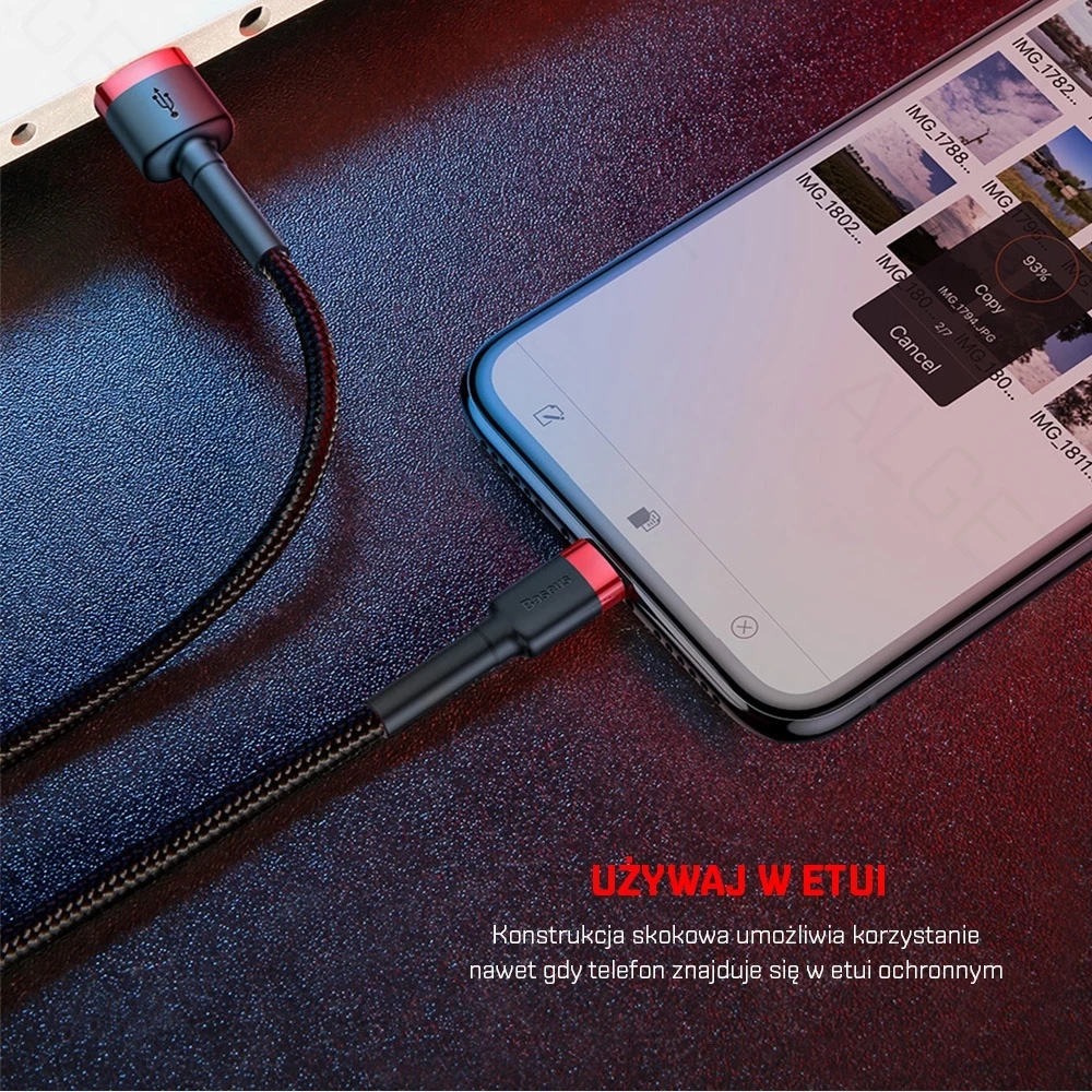 Kabel Lightning BASEUS Cafule - wytrzymały kabel, w którym zakończenia wtyków zostały zaprojektowane w taki sposób, aby przetrwały długie i intensywne użytkowanie. Produkt wyposażono również w specjalny nylonowy oplot, który zapobiega przecieraniu się i tym samym chroni przewody wewnątrz. Podniesiona została również wytrzymałość wtyków - przeszły test 10 tys podłączeń oraz zostały one specjalnie wyprofilowane, tak aby możliwe było użytkowanie kabla nawet w przypadku, kiedy Twój telefon znajduje się w etui. Kabel posiada funkcję szybkiego ładowania oraz przesyłania danych. Kabel obsługuje szybie ładowanie do 2,4A mocy. Kabel o długości 50 cm.