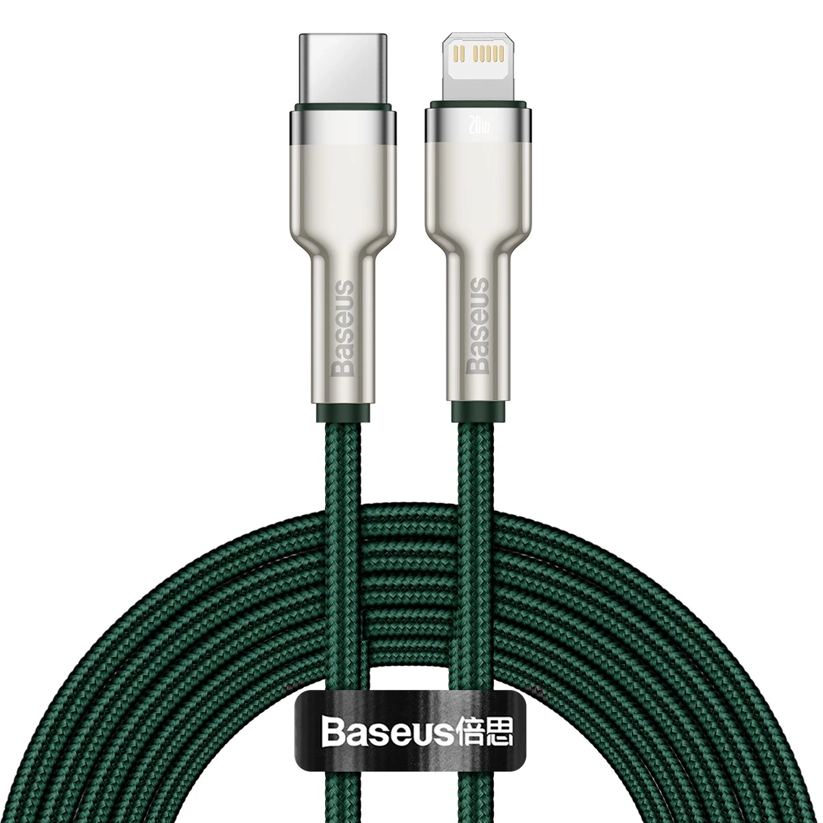 Producent Baseus Nazwa Cafule Series Metal Data Cable Type-C to iP Model CATLJK-B06 Materiał Stop cynku + pleciony nylon Kolor Zielony Moc PD 20W / PD 18W Prędkość transmisji Do 480 MB/s Długość 2 m Port wejścia USB-C Port wyjścia Lightning